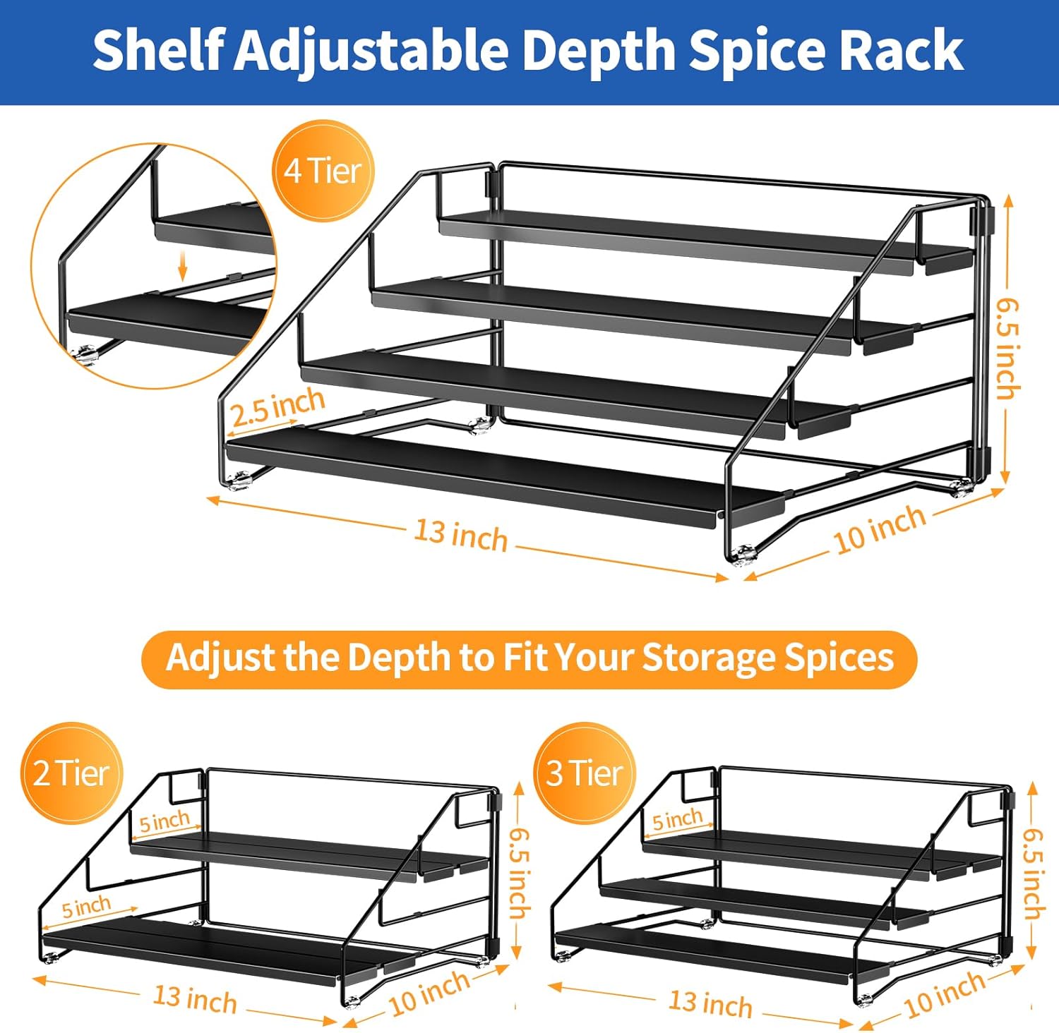 - Adjustable Depth Design, Rationalisation of Space: The spice rack adjustable depth, 4 shelf can be combined to adjust the depth at will. Adjust the depth according to the size of spices you are storing, making efficient use of cupboard space. The perfect storage solution for multi-size spice jars.