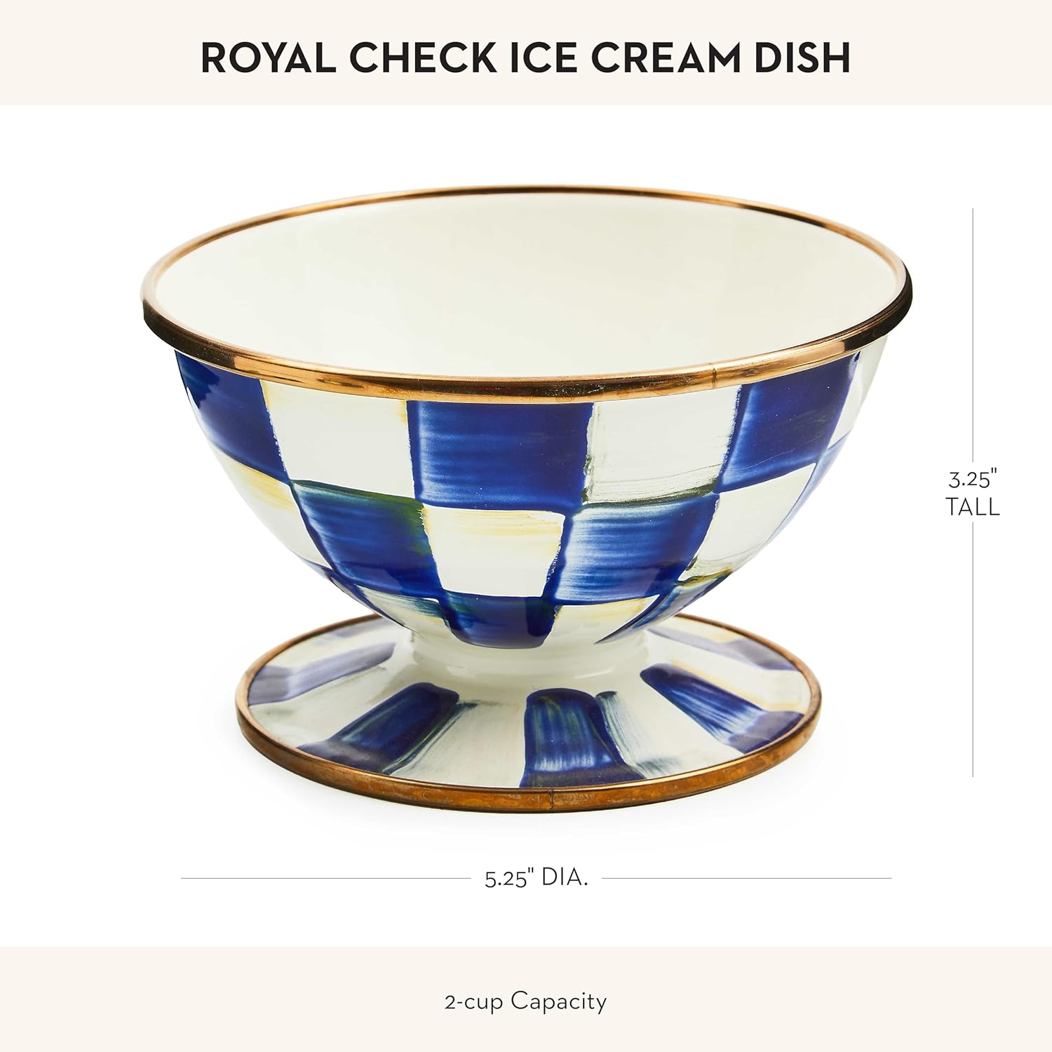 - ENTERTAINING & PARTY ESSENTIAL: The regal Royal Check pattern on this cute small bowl features glossy hand-painted blue-and-white checks. It has a 2-cup capacity, a hand-glazed heavy-gauge steel underbody, and a gold luster trim.