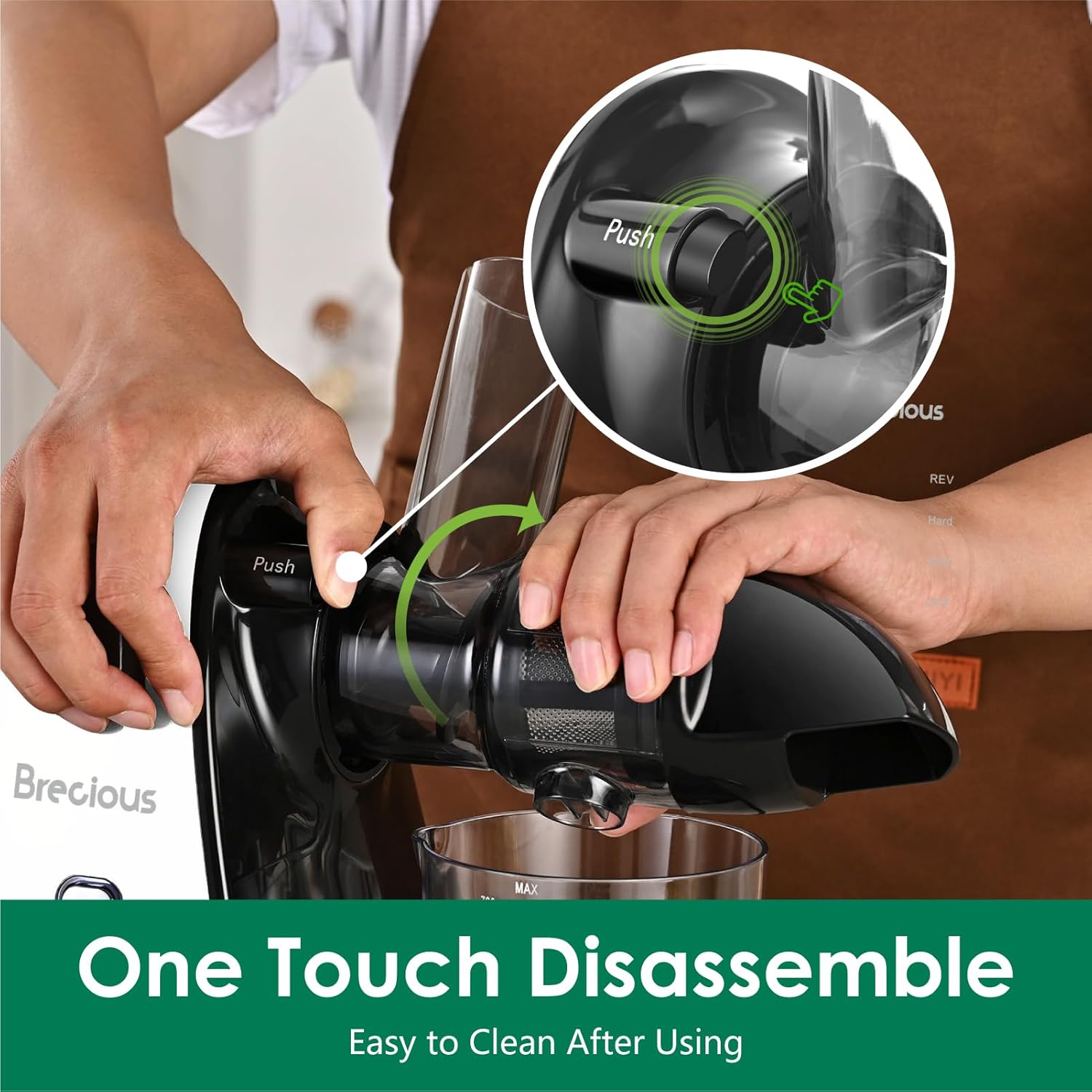 - Easy to Use & Clean: Easy to assemble. One-touch Disassemble. Press a button to remove the juicer body simply. We have equipped brushes for cleaning. All of the detachable parts can be sink rinsed with the brush. In addition, all detachable components can be placed in the dishwasher