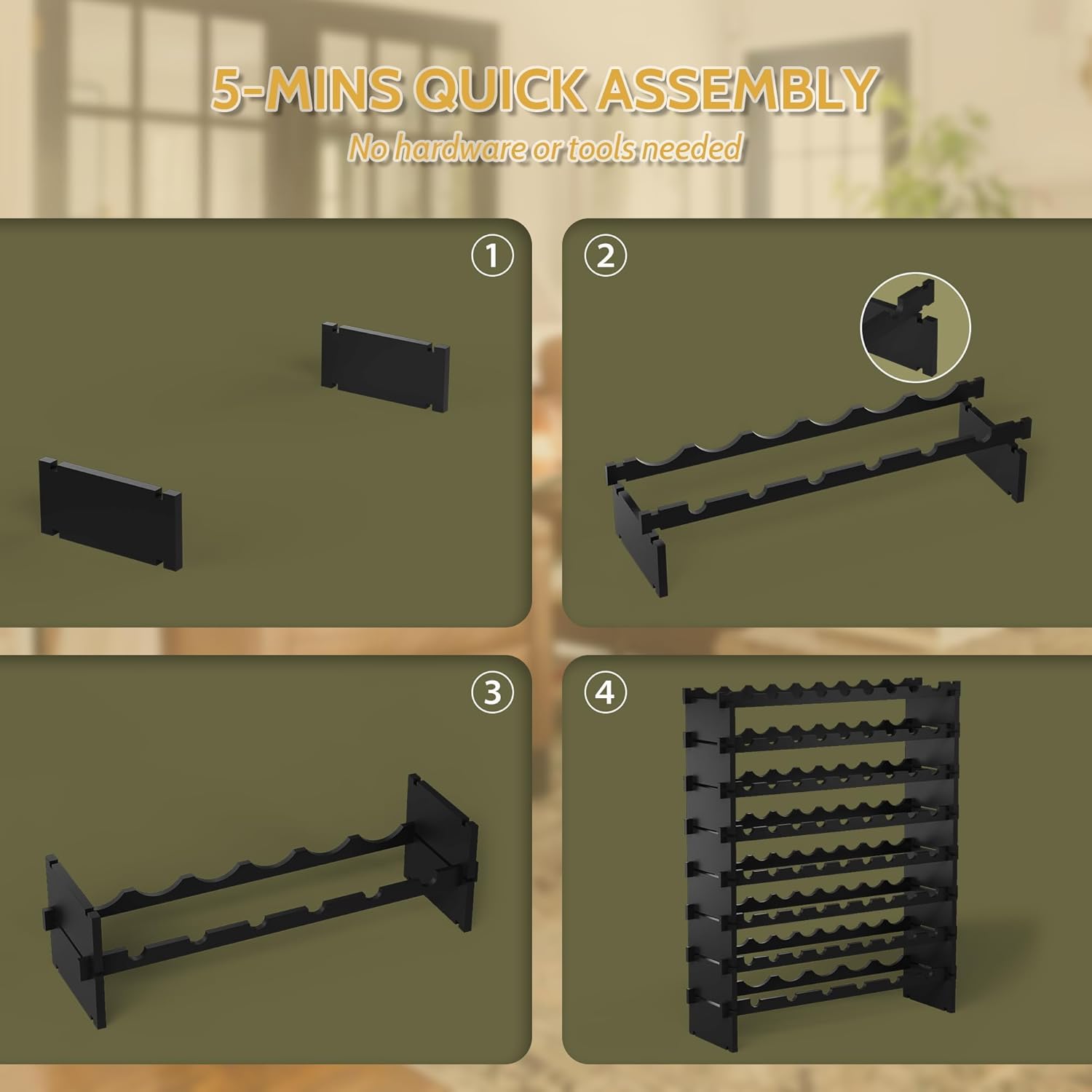 - šš®šš šššš²šŗšÆš¹š: Each shelf of this modular stackable wine rack features deep grooves and the partitions are tightly fastened to each other without loosening; No tools required, Simple follow the assembly instructions to combine the partitions in order, and you'll have an elegant wooden wine rack in about 5 minutes (Please make sure whether the parts are positioned correctly before assembly); If you need to move the wine rack, please be sure to remove the wine bottles first