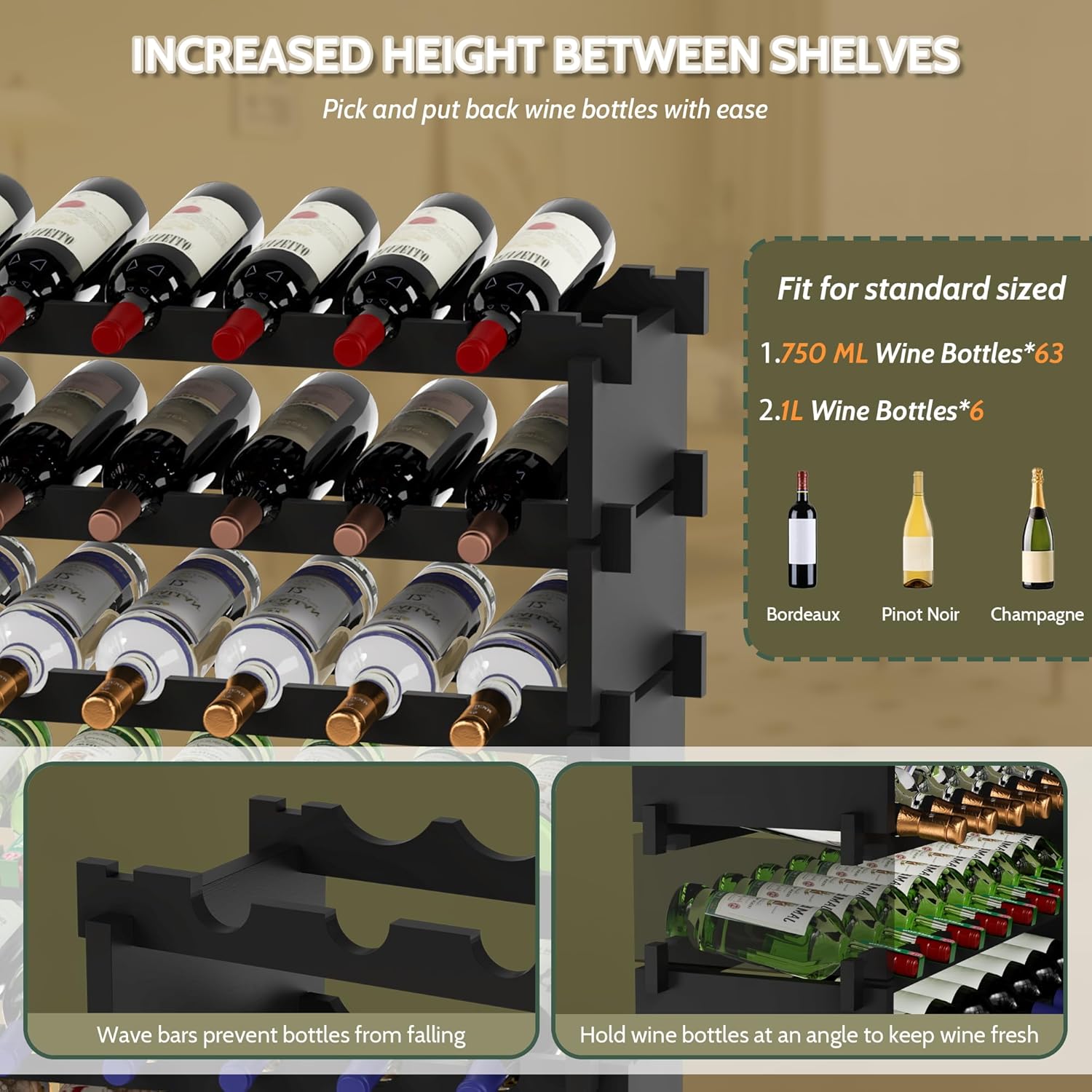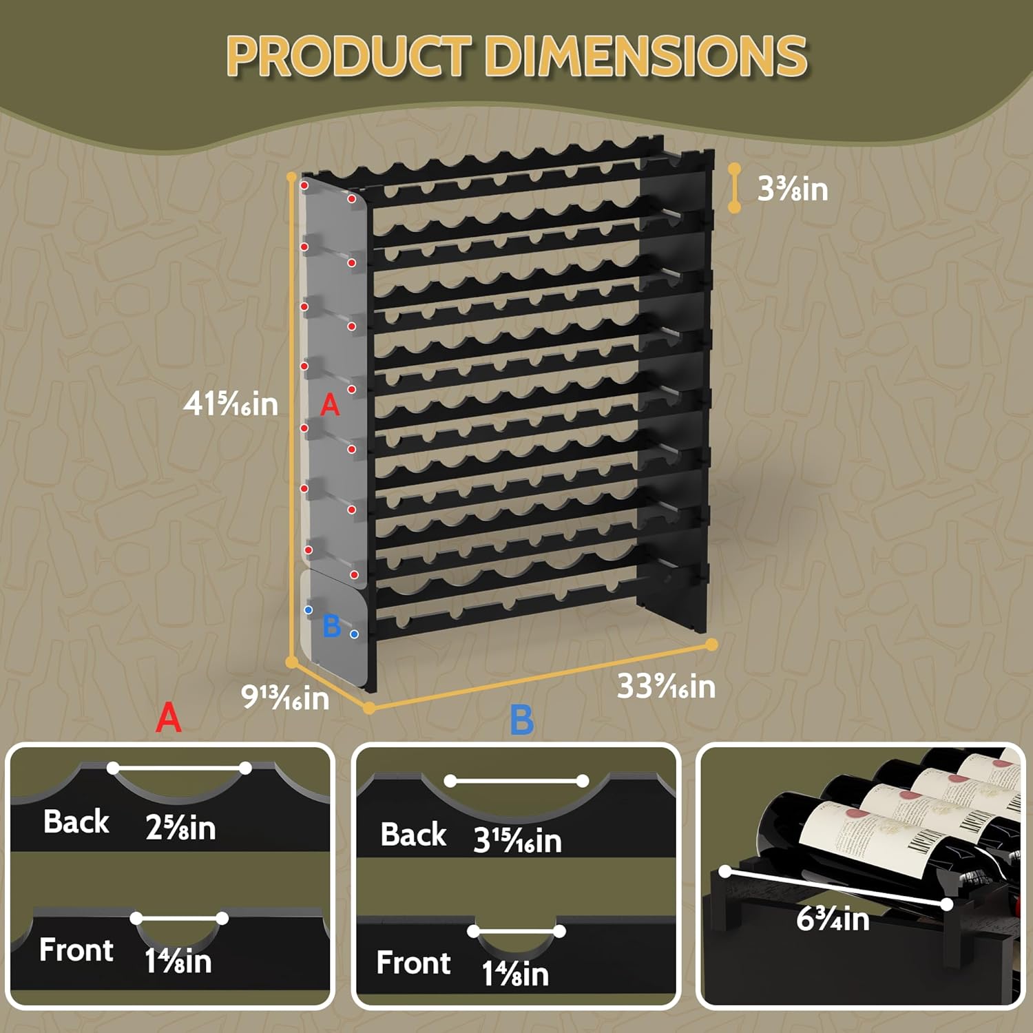 - š²šµ šš¼ššš¹š²š šš®š½š®š°š¶šš: Assembled dimensions are approx.: 33.5" L x 10" W x 40.98" H; This wine racks free standing floor is perfect for showcasing your favorite vintages; It accommodates not only standard 750ml bottles but also has one layer with wider spacing to accommodate larger bottles, fitting 90% of bottle sizes on the market, catering to both seasoned collectors and those just starting their wine journey