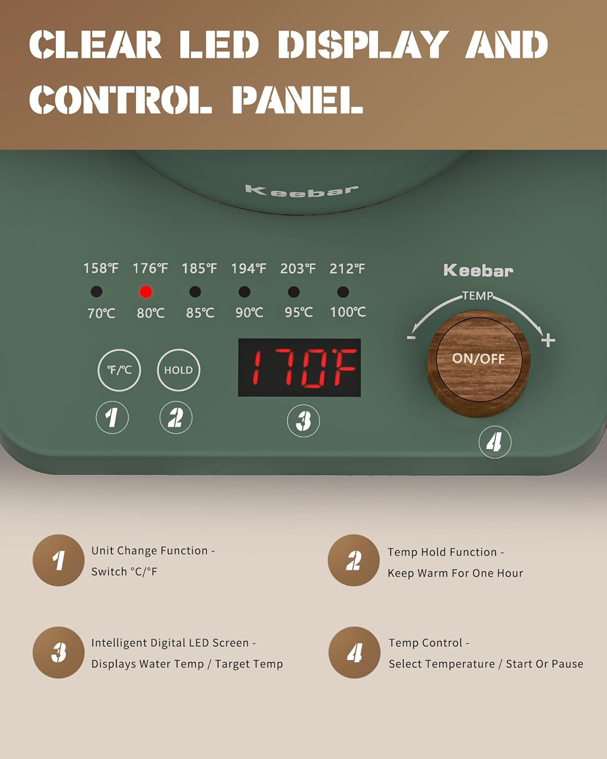 - Intelligent Digital LED Display - The newly designed intelligent digital LED display on the KEEBAR electric gooseneck kettle displays both the desired set temperature and the real-time temperature, perfect for brewing drip coffee or tea with precision.