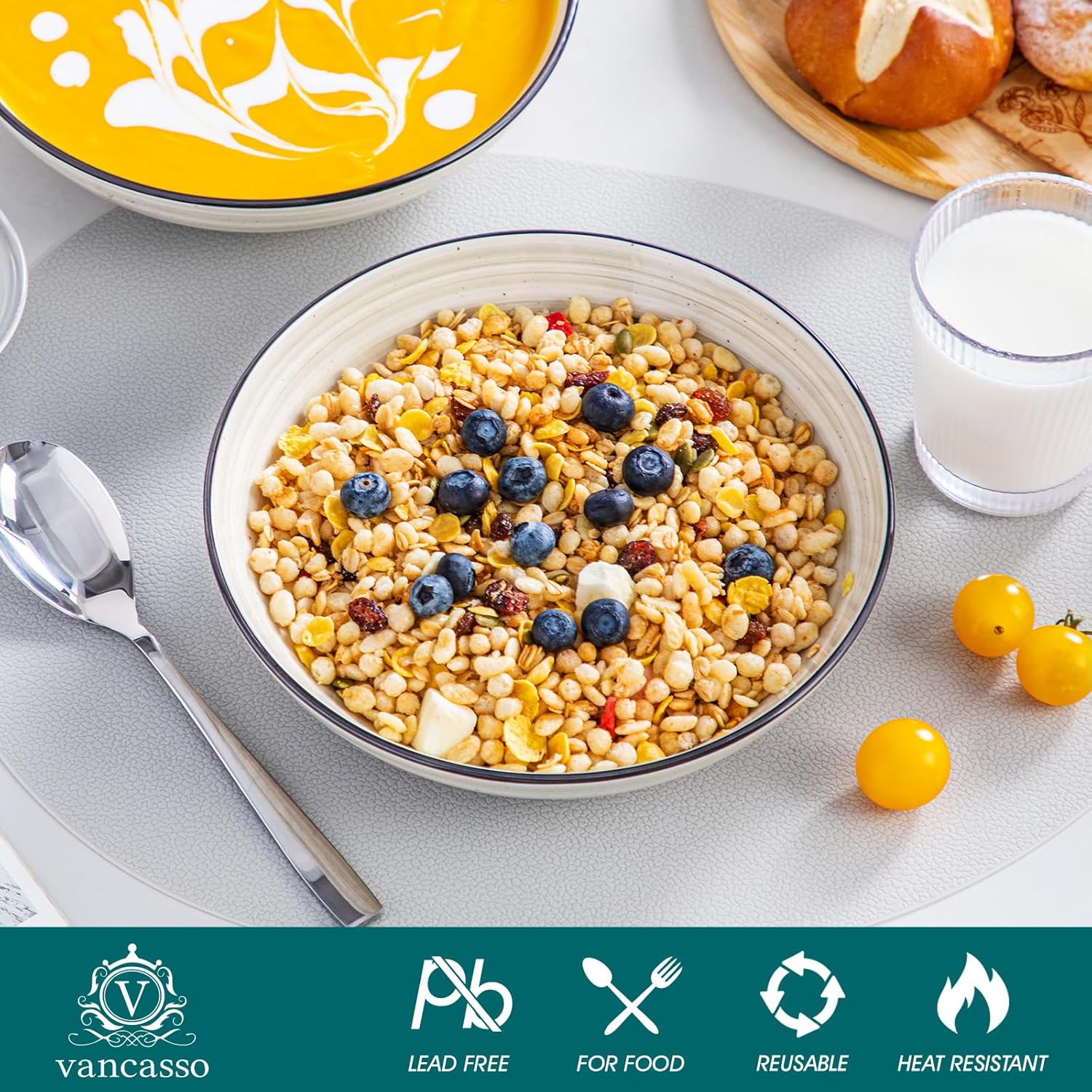 - 【Multifunctional Pasta Bowls】 These shallow bowls set are suitable for soups, cereal, burrito bowls, stir fries, seafood, stews, casseroles, and more. vancasso pasta bowls are suitable for all delicious food!