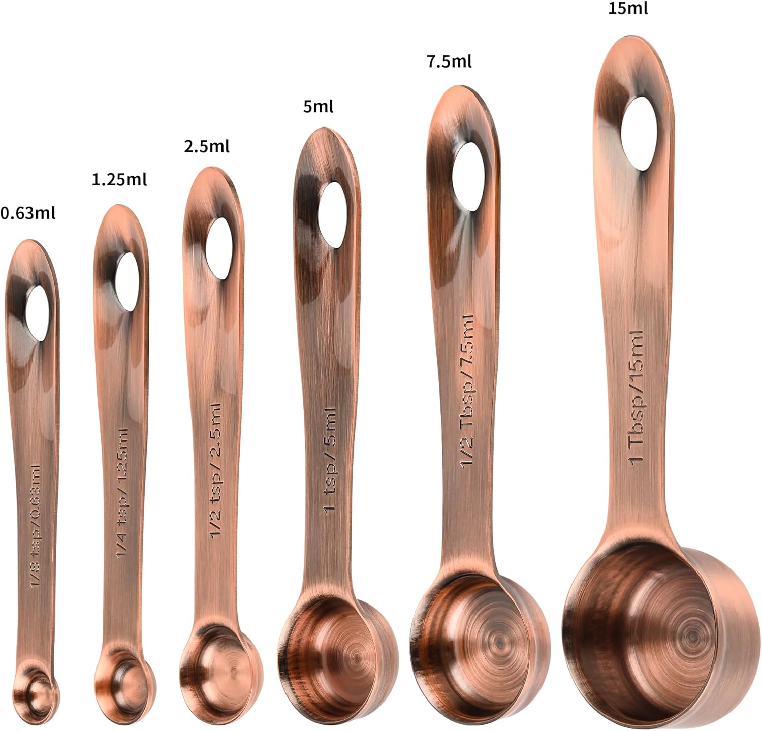 - ✱✱SIX SIZES FOR KITCHEN NEEDS :This copper measuring spoons set has 6 measuring spoons: 1/8 tsp, 1/4 tsp, 1/2 tsp, 1 tsp, 1/2 tbsp, 1 tbsp and 1 locking ring.