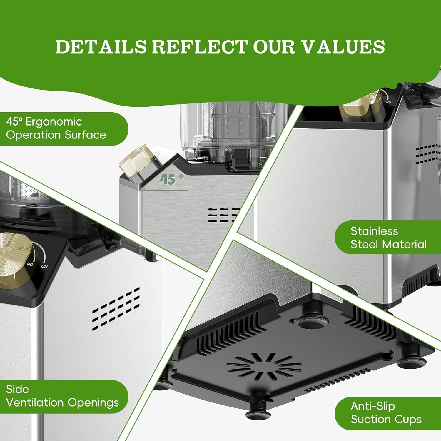 - 【Designed with Your Experience in Mind】: This electric juicer incorporates many thoughtful design details: a comfortable 45° angled control panel, a durable stainless steel body shell, an enhanced cooling system to extend its lifespan, and non-slip, vibration-absorbing suction cups... These innovative features are all intended to provide you with an exceptional user experience!