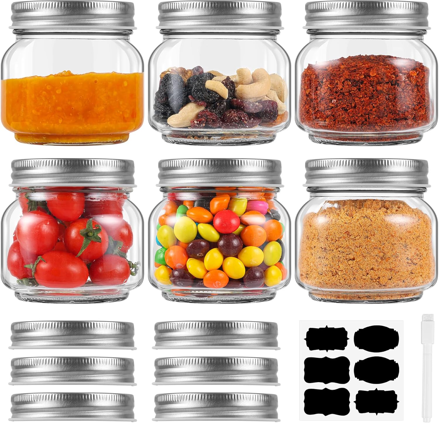 12 Pack Small Mason Jars with Labels, 8 oz Glass Jars with Metal Lids, Half Pint Canning Jars for Jelly, Jam, Honey, Pickles, Spice, Overnight Oats, Food Storage, Candle & DIY Present