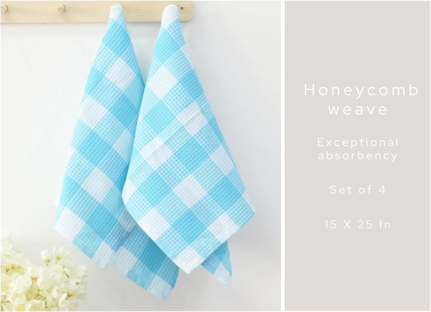 PurpleEssences 100% Cotton Waffle Weave Check Plaid Kitchen Towels, Super Soft and Absorbent Dish Towels for Drying Dishes 15 x 25-4 Pack - Spring Summer - Aqua Blue and White