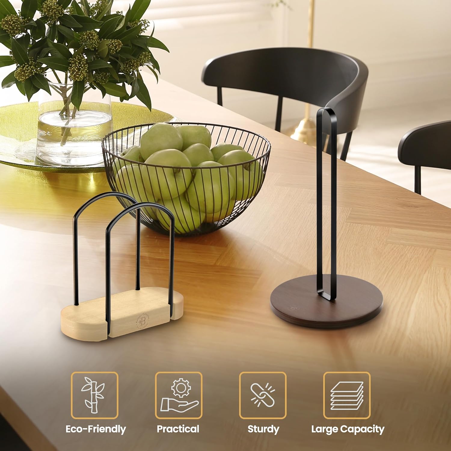 - Elegant Design: Featuring a modern round design with a sleek black rod and natural base, this napkin holder by Bambüsi is a stylish addition to any dining table decor. Its minimalist look enhances the elegance of any setting, from kitchens to offices.