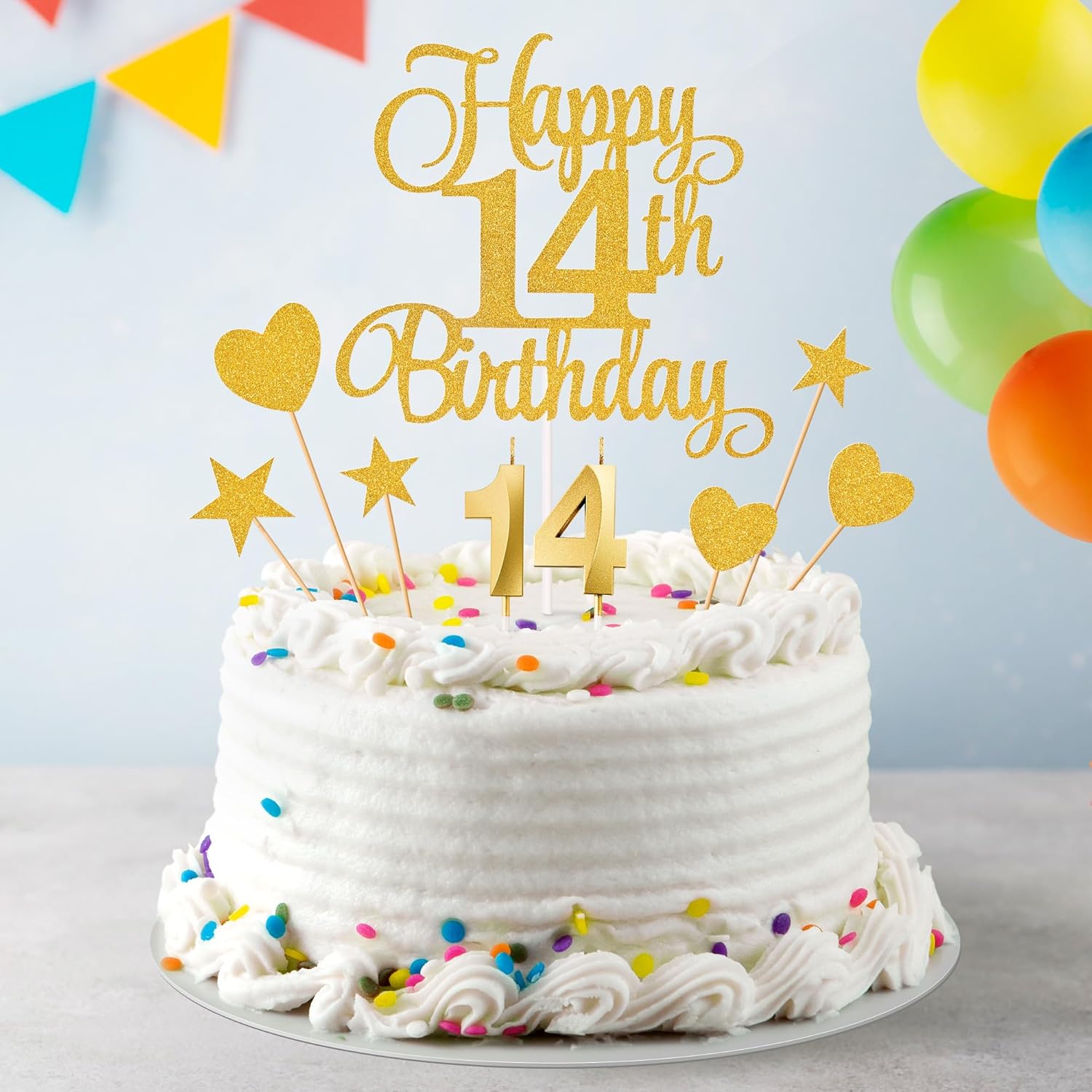 14th Birthday Cake Decorations, 14th Birthday Candles Cake Numeral Candles and Glitter Happy 14th Birthday Cake Toppers Set for Birthday Party Supplies (Gold)