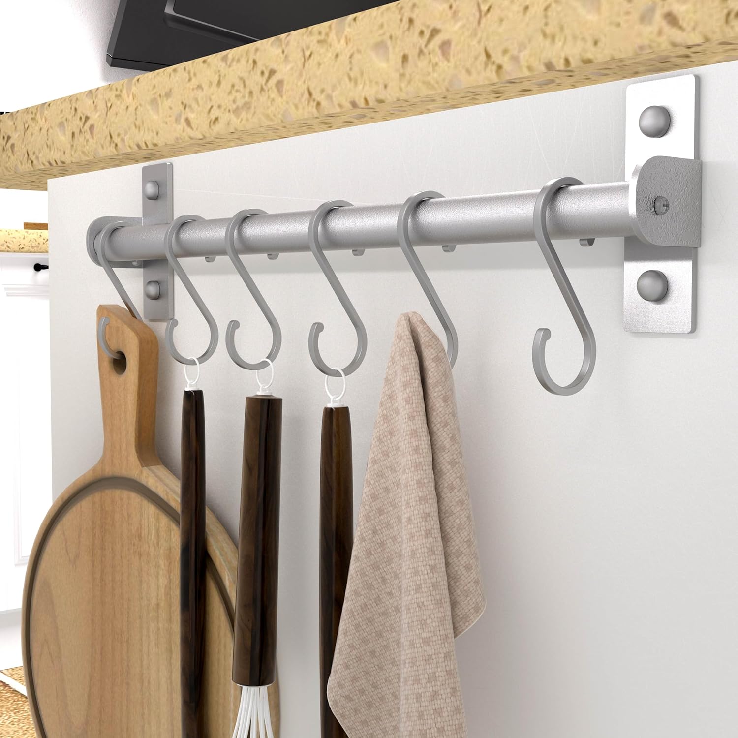 - Easy to install, sizes: 15-3/4 L x 4-1/2 H x 1-5/8 inch, including 1 x kitchen rail with 8 S hooks, mounting hardware, silver color,