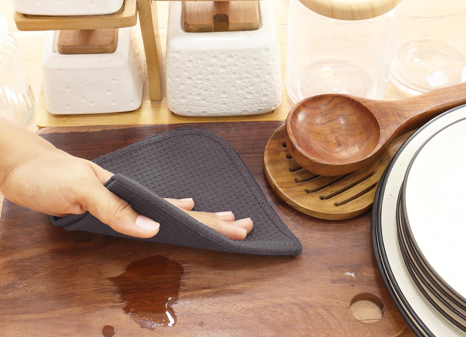 PurpleEssences Dish Cloths and Dish Rags - 6 Pack Waffle Weave Solid Kitchen Dish Wash Cloths, 100% Cotton, 12 x 12 Inches, Ultra Soft Absorbent Quick Drying - Spring Summer - Dark Grey