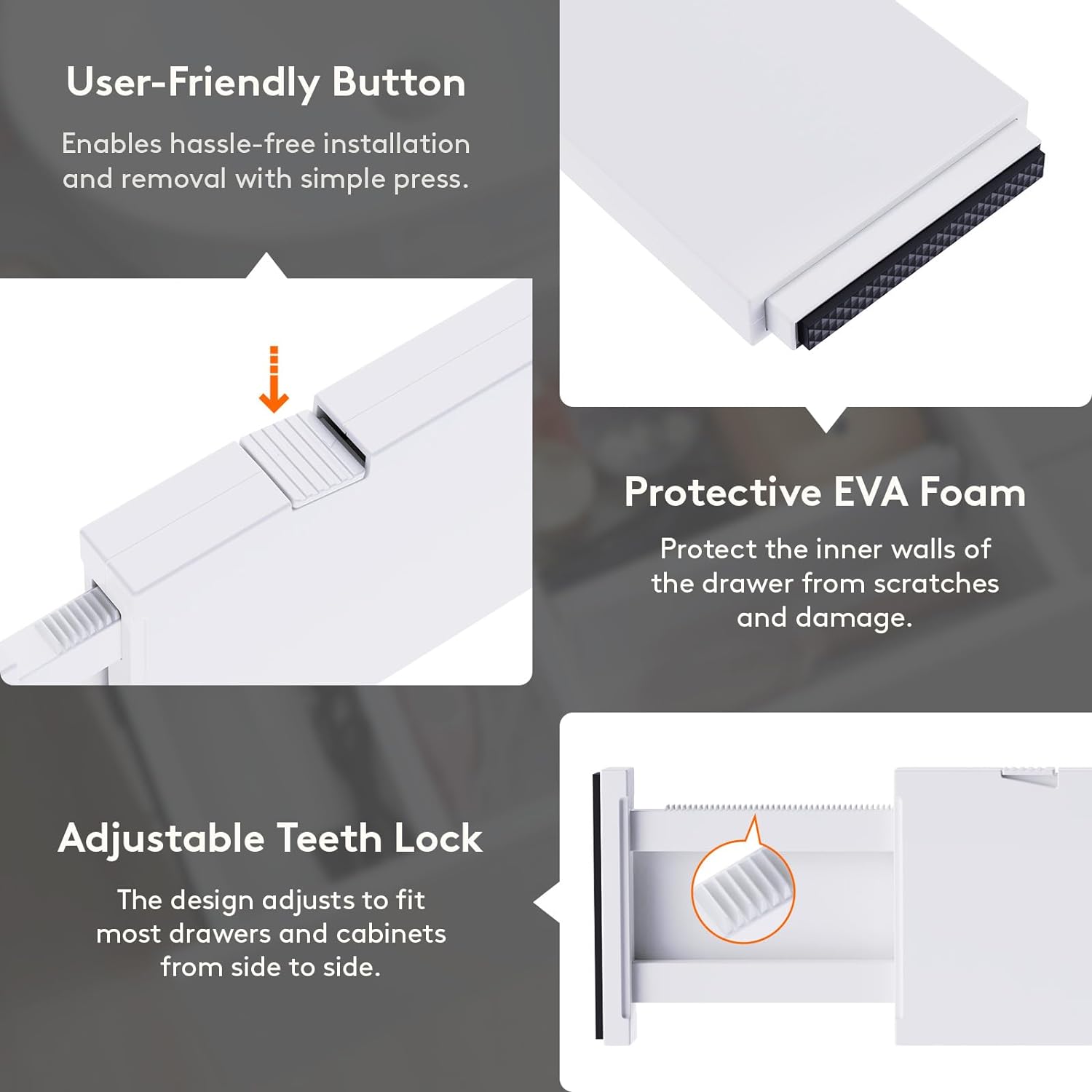 - Advanced Design: Our drawer organizer for clothing is made from stable ABS material and has high-quality EVA foam sponges at the ends to prevent scratches and damage to drawer walls, leaving no trace or residue. Additionally, our divider is patented (Patent No: US12133593B2) for a unique experience.