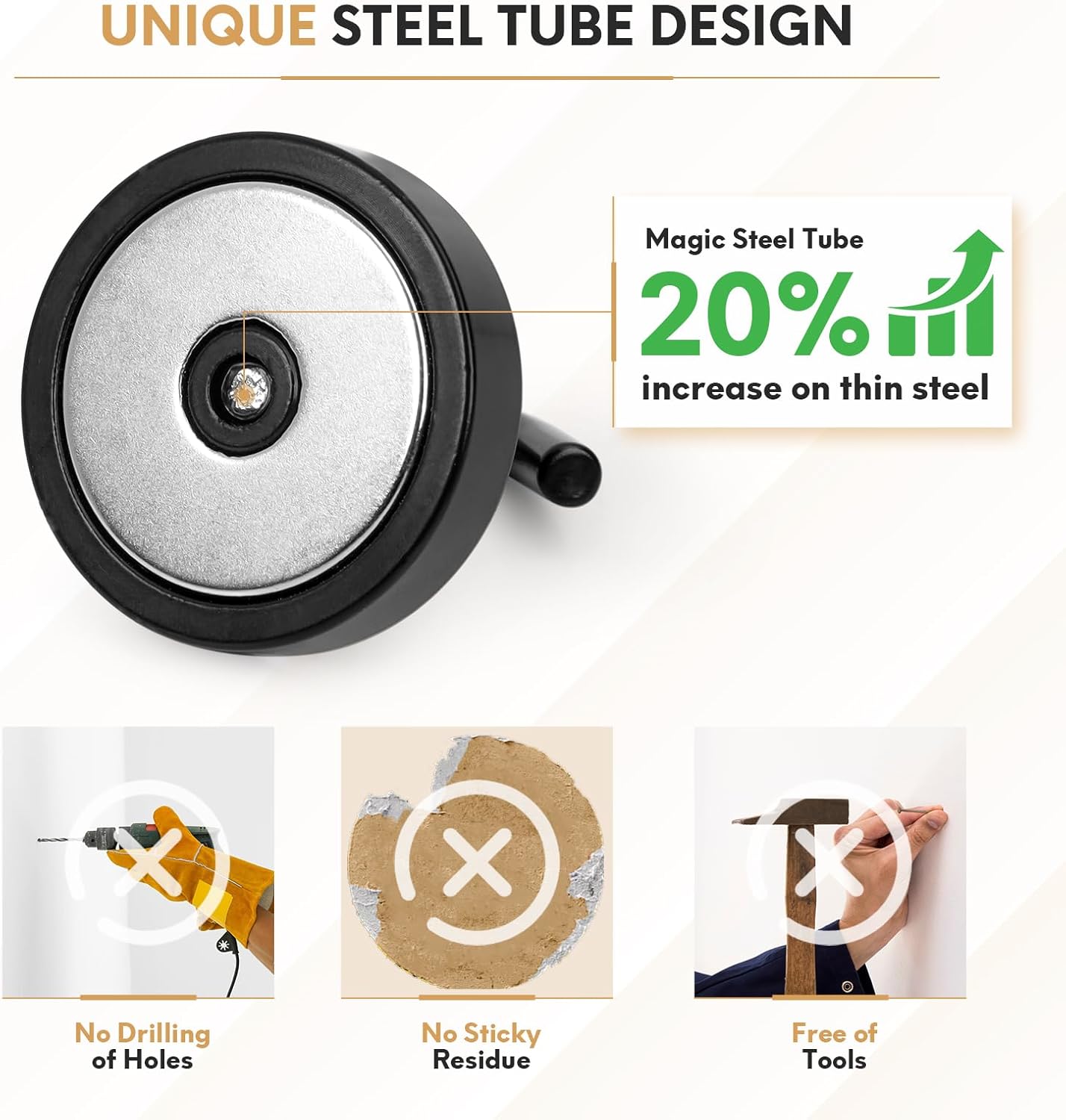 - ✔MAGIC STEEL TUBE DESIGN - Unique design of steel tube inside the base of magnetic hooks greatly increases the attractive force , especially on thin steel! It increase approximately 20% force comparing those none-tube magnets. it solves the problem of weak force on thin steel. Permanent magnetic hook with magic steel tube, strong magnetism lasts forever!