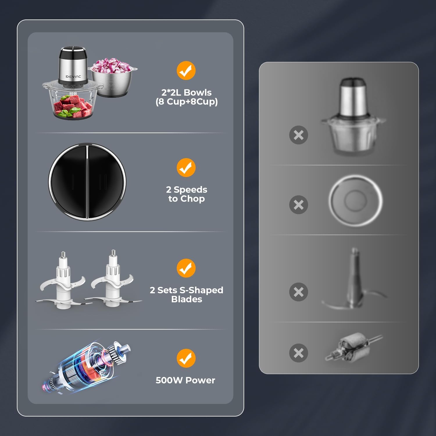 - Special Feature : Food Processor; 8 cup+8 cup bowls; 2 Bi-level Blades; Anti-slip Base; 2 Adjustable Speed Control; Dishwasher Safe; Meat Grinder; Vegetable Chopper Food Processor; 8 cup+8 cup bowls; 2 Bi-level Blades; Anti-slip Base; 2 Adjustable Speed Control; Dishwasher Safe; Meat Grinder; Vegetable Chopper