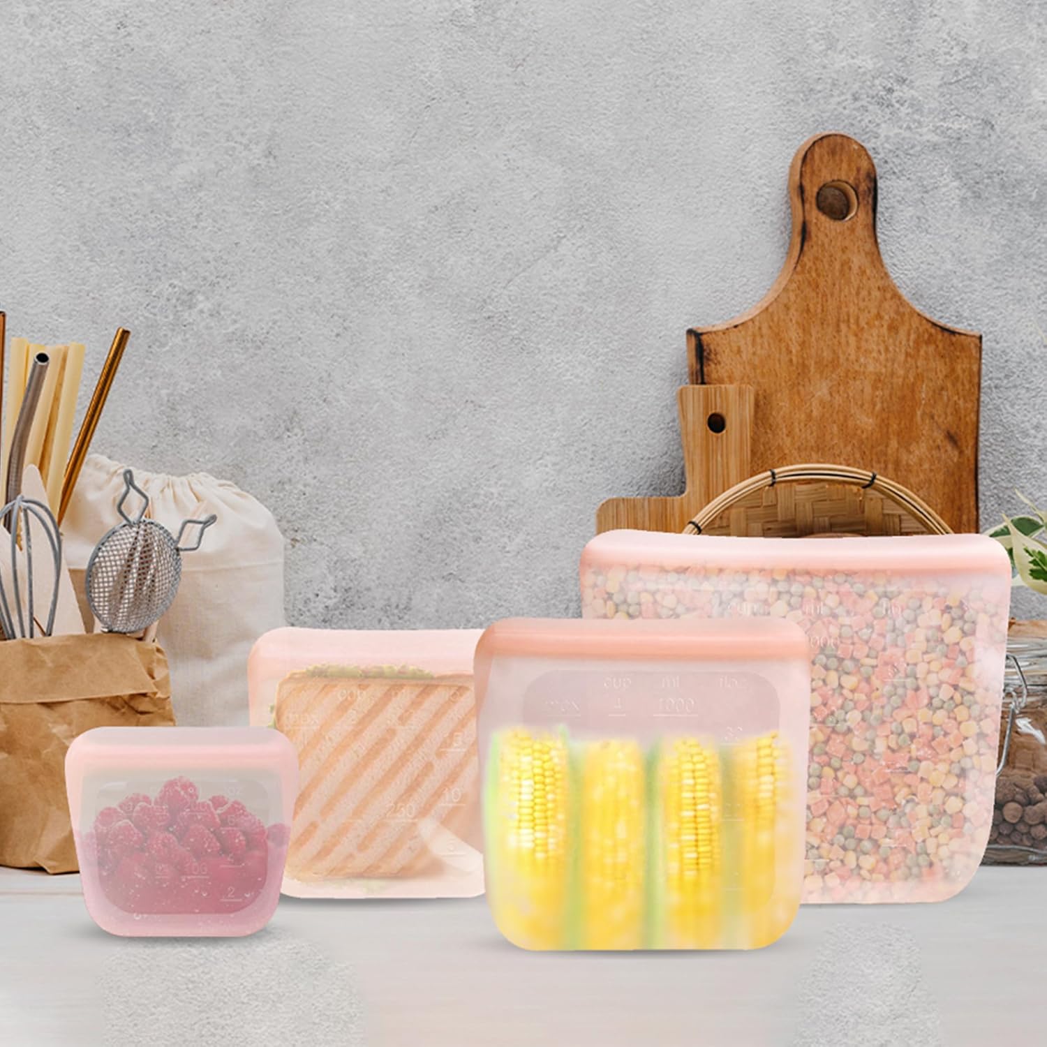 purifyou Set of 4 Reusable Silicone Storage Snack Bags 6oz / 16oz / 32oz / 64oz Self-Seal Food Storage Container for Fruits, Vegetables, Sandwiches, Dishwasher Safe & Leak-free (CloudPink)