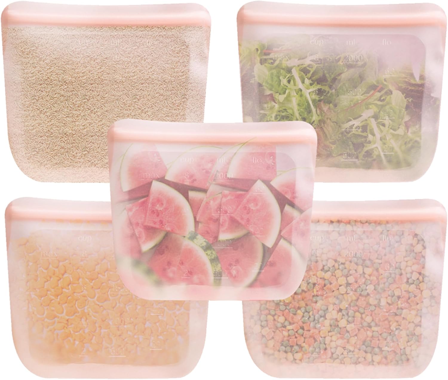 purifyou Set of 5 Reusable Silicone Storage Snack Bags 6oz / 16oz / 32oz / 64oz Self-Seal Food Storage Container for Fruits, Vegetables, Sandwiches, Dishwasher Safe & Leak-free (CloudPink, 64oz)