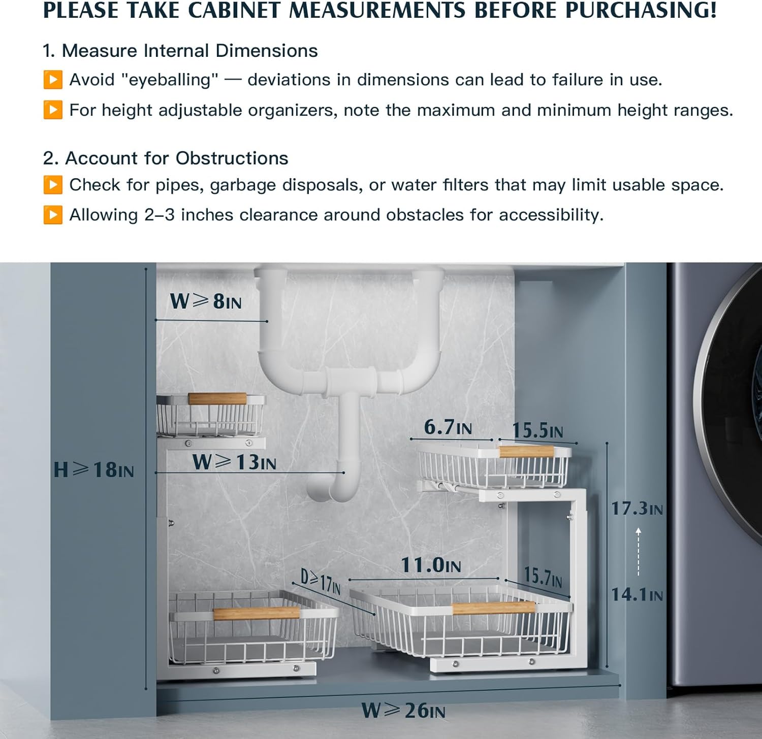 - Dual Pull-out Design: 2 tier pull out cabinet organizers comes with unique silent slides and is additionally equipped with wooden handles for easy pull-out. Compared to other under cabinet shelves on the market, it not only achieves silent pull-out, but also more convenient to access.