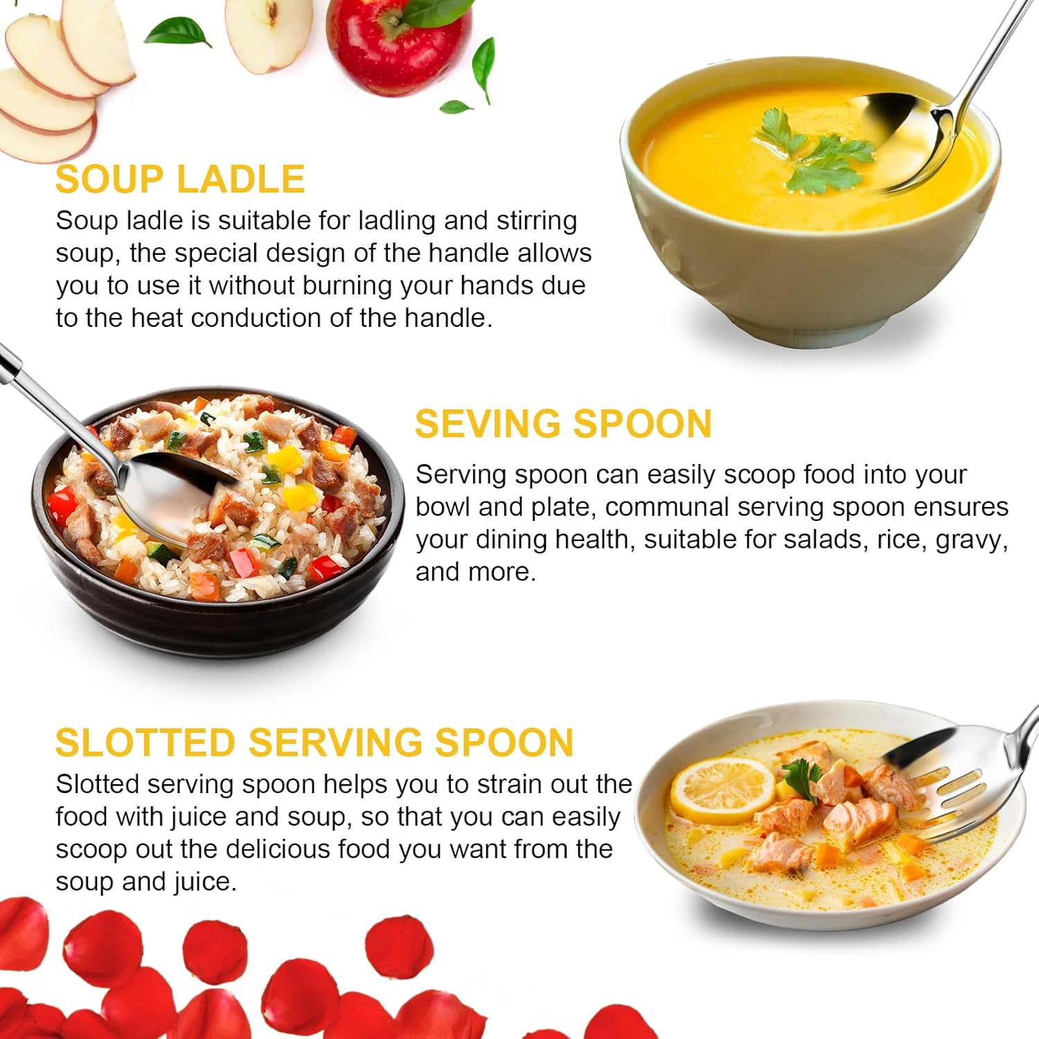- 【3 Piece Serving Spoons Set】When you buy this stainless steel utensils set, you will get a serving spoon, a slotted spoon, and a soup ladle, the serving spoon can be used to ladle soup or stir salad, the slotted spoon can be used to strain the soup, and the soup ladle can be used to ladle soup or stir the bisque. Thus, the 3 piece stainless steel serving spoons can fulfill your party needs