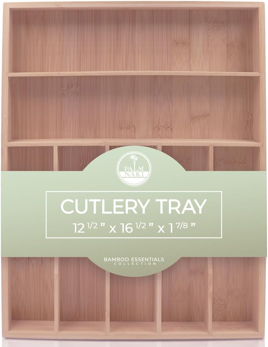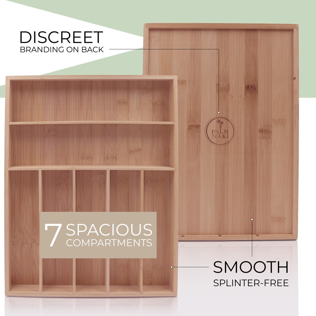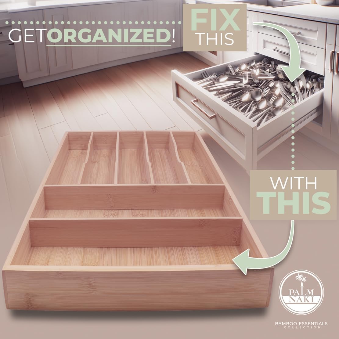 - πΏ Transform Your Space with Elegance and Efficiency - Discover the ultimate solution to declutter your drawers and beautify your home with Palm Naki's premium bamboo cutlery tray. Designed with precision, our organizer features expansive compartments tailored to fit drawers of any size, ensuring a custom fit that brings harmony and accessibility to your kitchen, office, or vanity.