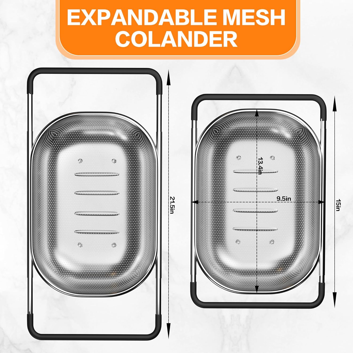 Over the Sink Colander - Strainers and Colanders - Sink Strainer Basket - Expandable Fine Mesh Strainer with Rubber Grip for Veggie, Fruits, Pasta, Home Kitchen Essentials (9.5W x 13.4-21.3L x 3.3H)