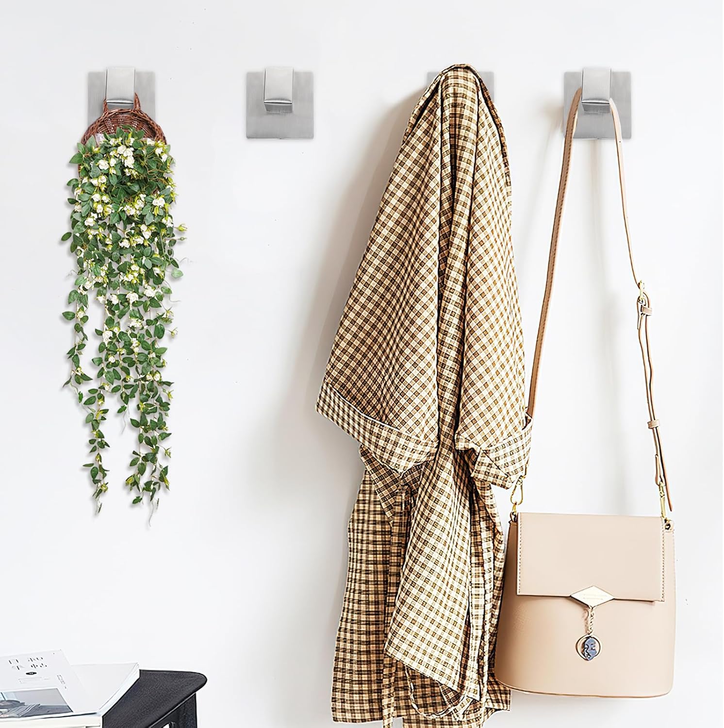 IBosins 4 Pack Towel Hooks Hand Towel Holder for Bathroom Wall Livingroom Bedroom Kitchen Closet Heavy Duty Stainless Steel Hook Hanger for Robe, Bath Towel, Coat (Square Brushed Silver)