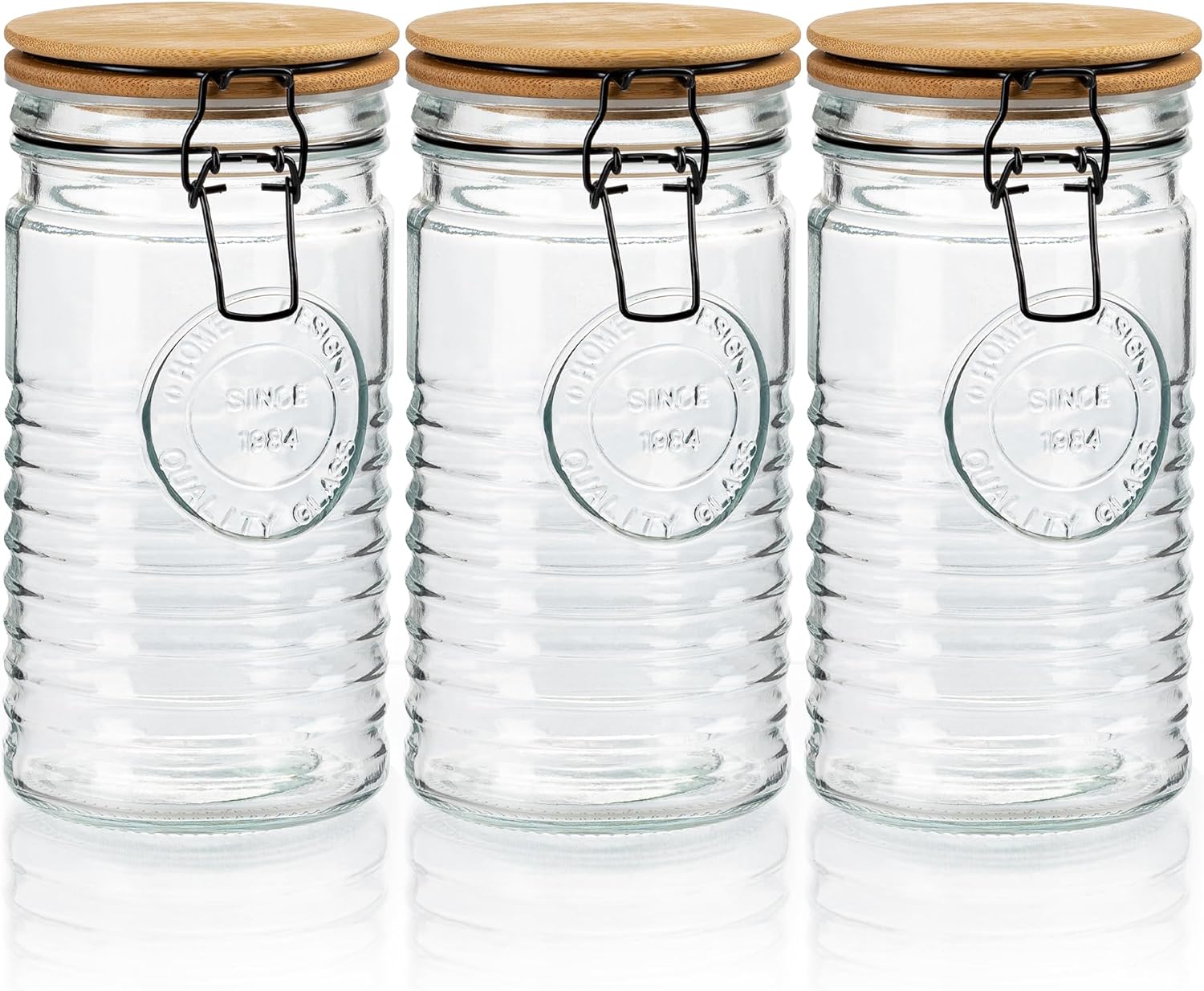 Glass Storage Containers with Airtight Lids - 40 Ounce Mason Jar Storage Containers for Cereal, Coffee & Rice - Pantry Organizing Canister Set of 3 for Kitchen