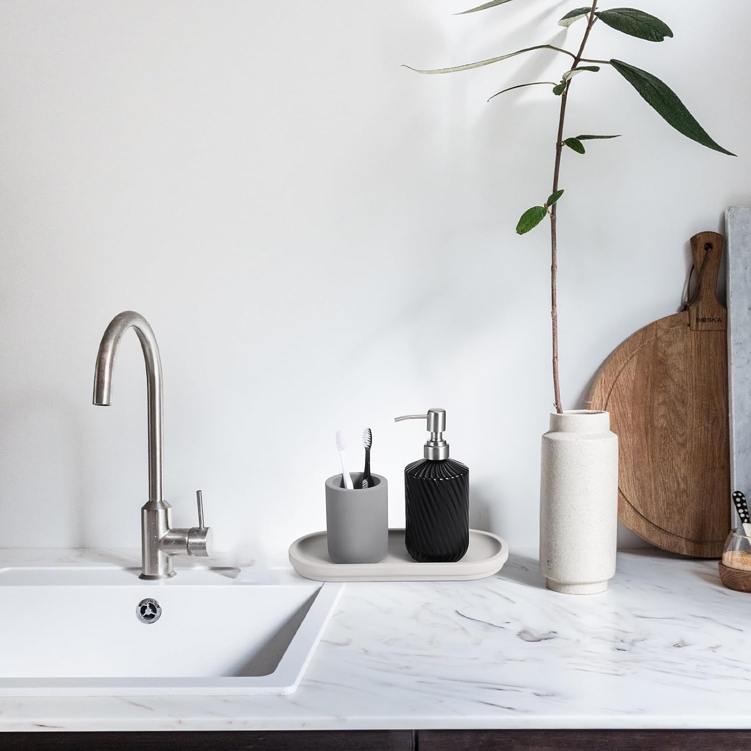 - Compact Yet Spacious: This oval stone tray measures 1 inch high, 4.9 inches wide, and 11 inches across. It is very roomy to rest 2 glass bottles, 1 dish sponge plus 1 dish brush, everything you need is close at reach.