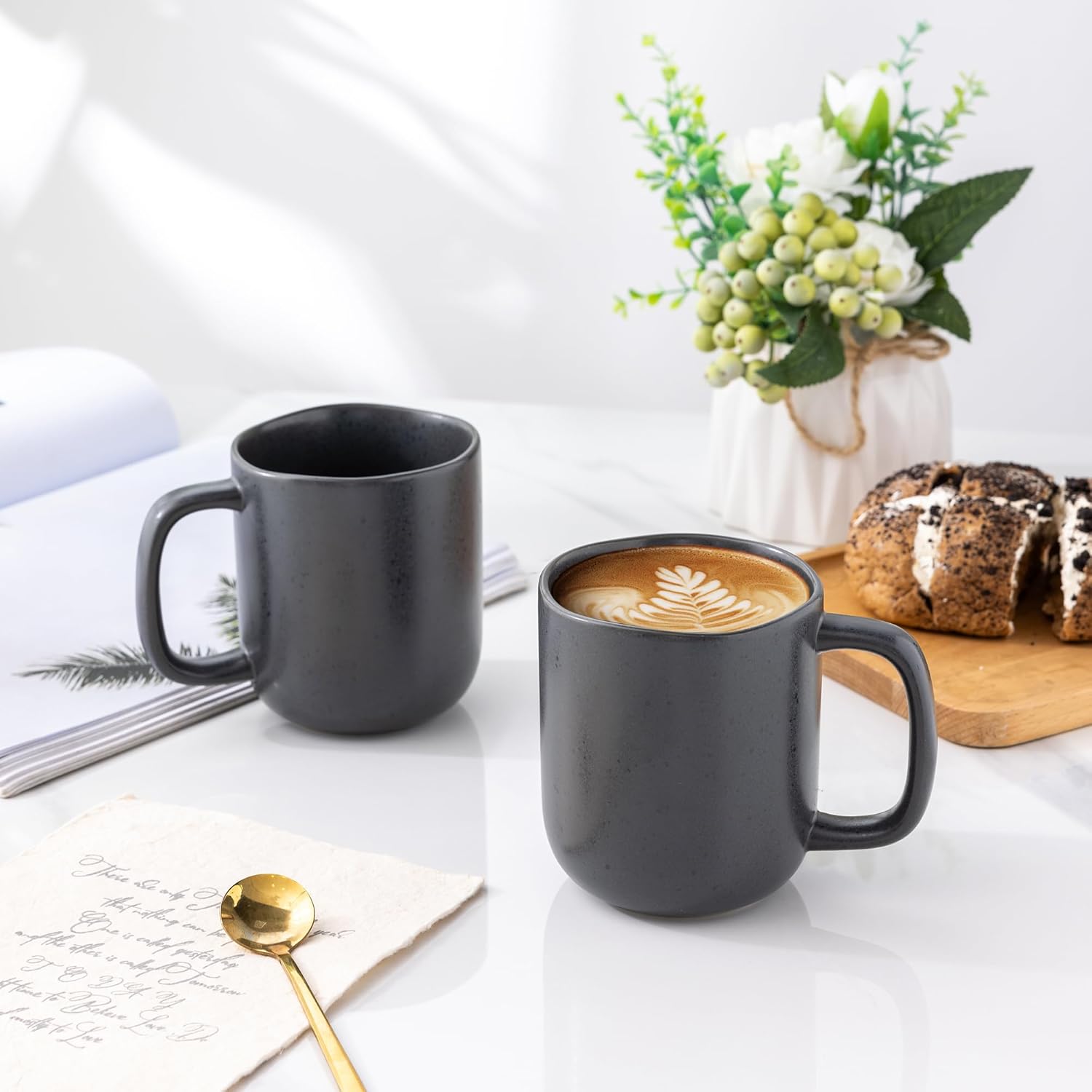 - 14OZ & VERSATILE : Perfect size for home and office daily use, even if you don't want to fill them, a normal cup of beverage is easier to handle without concern of spilling. Large capacity not only meet your coffee need, But also a great choice for tea, soup cocoa and more.