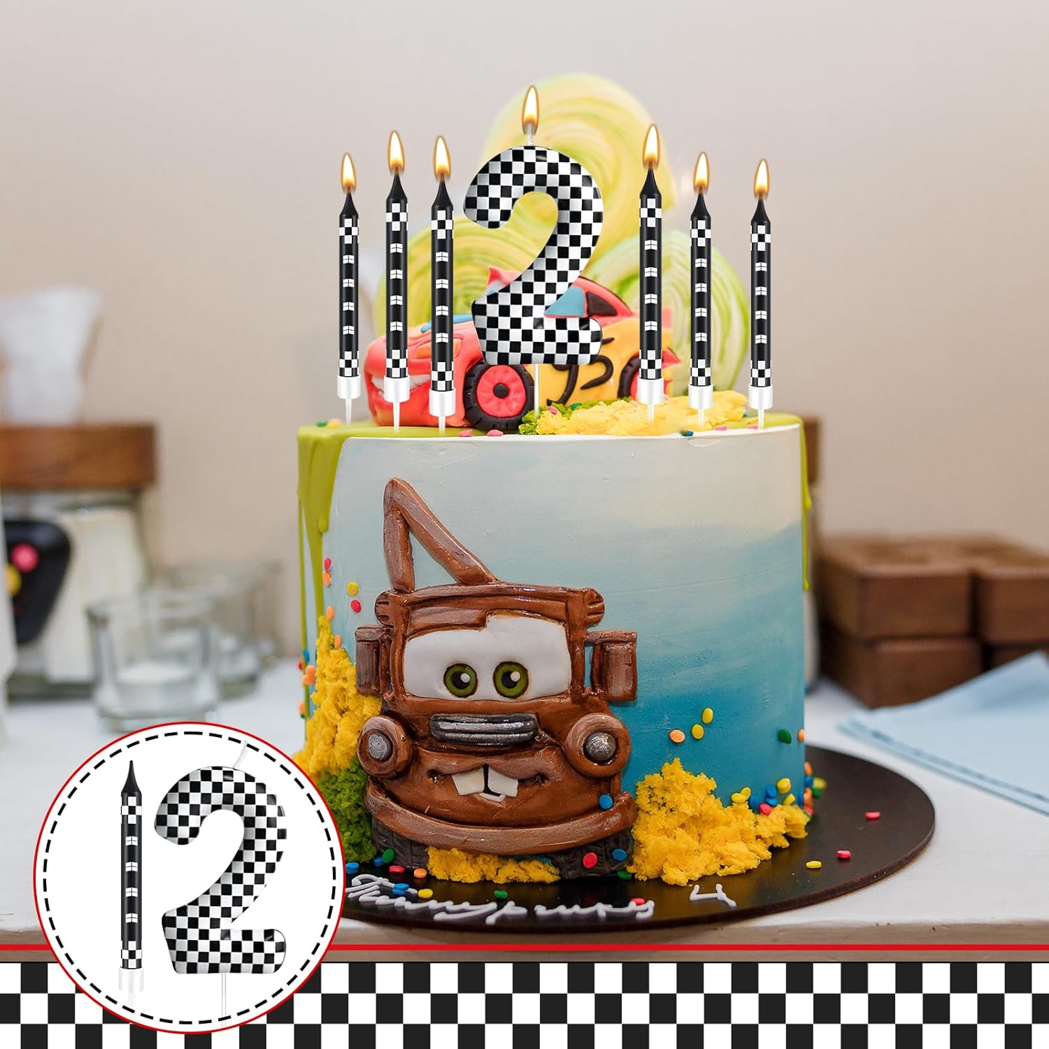 - The Package Includes: You will receive 12 black and white track car themed birthday candles and 1 number 2 black and white checkered candle, Sufficient quantity for birthday cake decoration or party celebration and daily use, note: the candle will slowly melt as it burns, and it is recommended not to leave it on the cake for more than two minutes