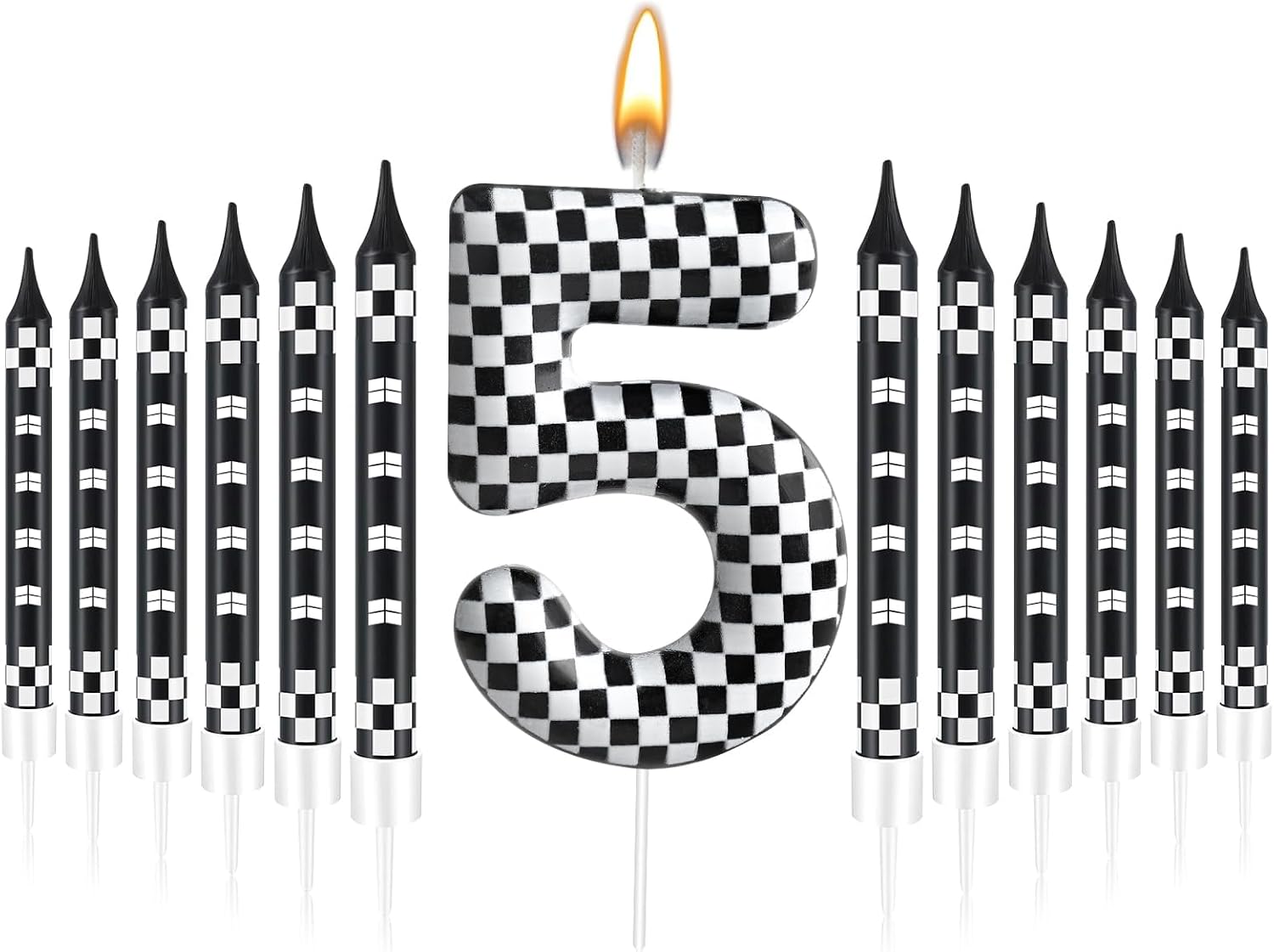 - The Package Includes: You will receive 12 black and white track car themed birthday candles and 1 number 5 black and white checkered candle, Sufficient quantity for birthday cake decoration or party celebration and daily use, note: the candle will slowly melt as it burns, and it is recommended not to leave it on the cake for more than two minutes