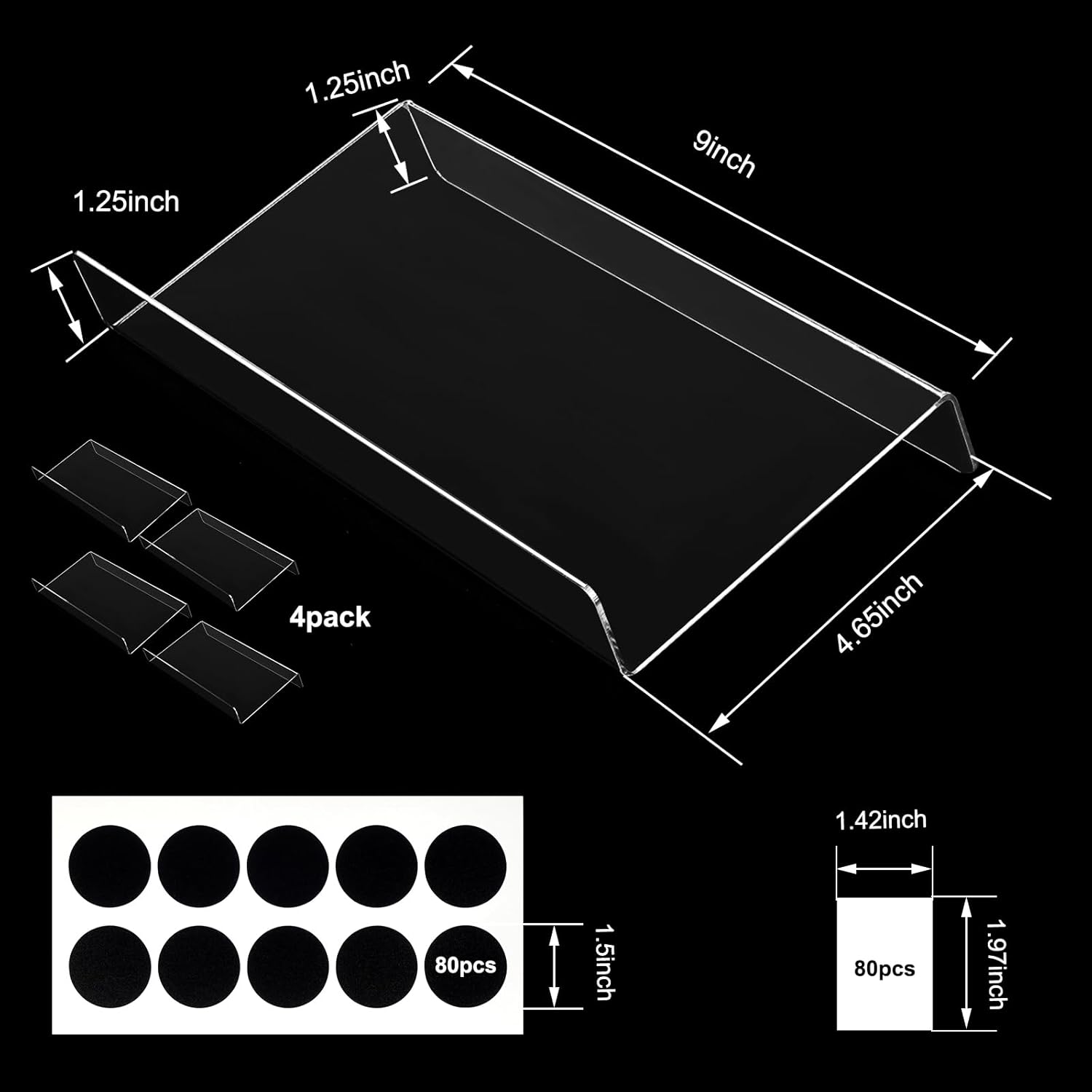 - The packaging includes:4 Pcs clear spice drawer organizer(size 9" * 4.65" *1.25"),80 Smooth surface Round Black Labels,80 Smooth surface White Rectangle Labels.