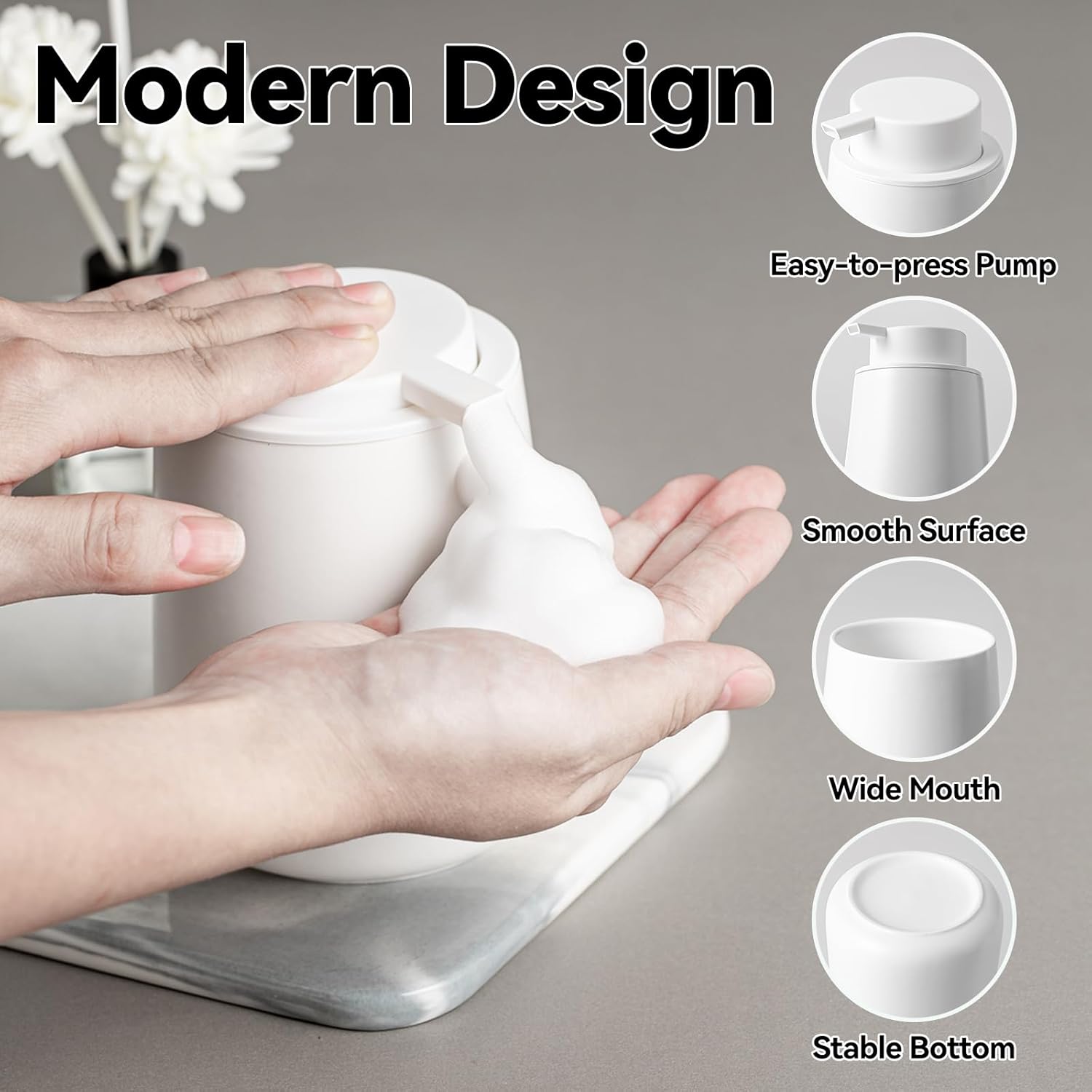 - Foam Soap Dispenser: Ceramic foam hand soap dispenser can be filled with a variety of room temperature foaming liquid for daily use
