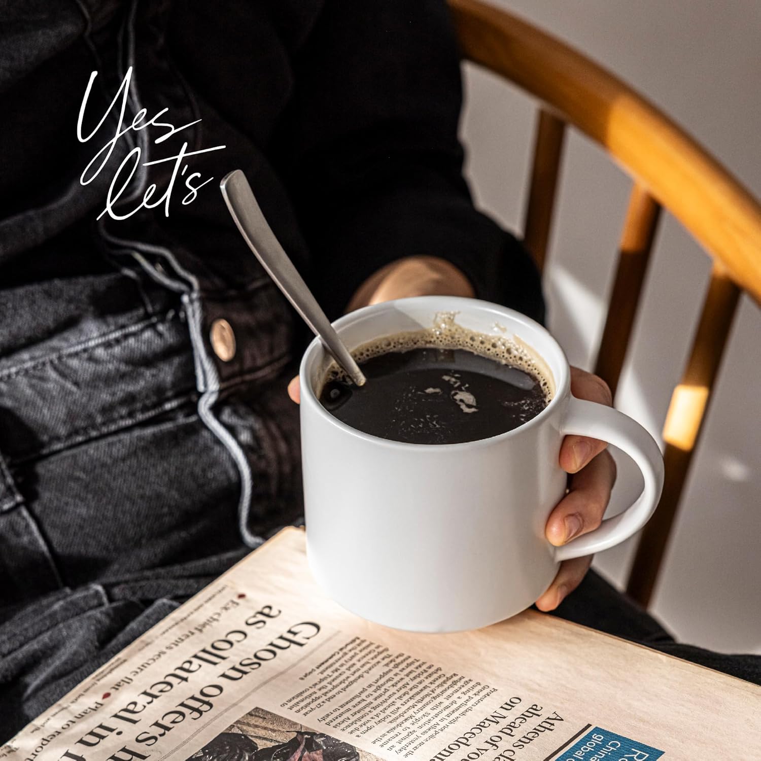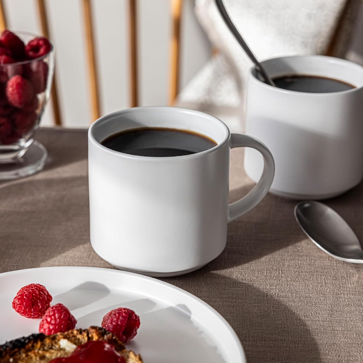 - Stylish & Functional Stoneware Mug Set – Crafted from high-quality stoneware, this coffee mugs set of 4 is perfect for daily use or casual entertaining. The semi-matte white finish adds elegant contrast to any kitchen, while the stackable coffee mugs design saves precious shelf space. These 14 oz coffee mugs blend modern style with timeless charm—perfect for tea, latte, or your favorite morning brew. Upgrade your drinkware game instantly.
