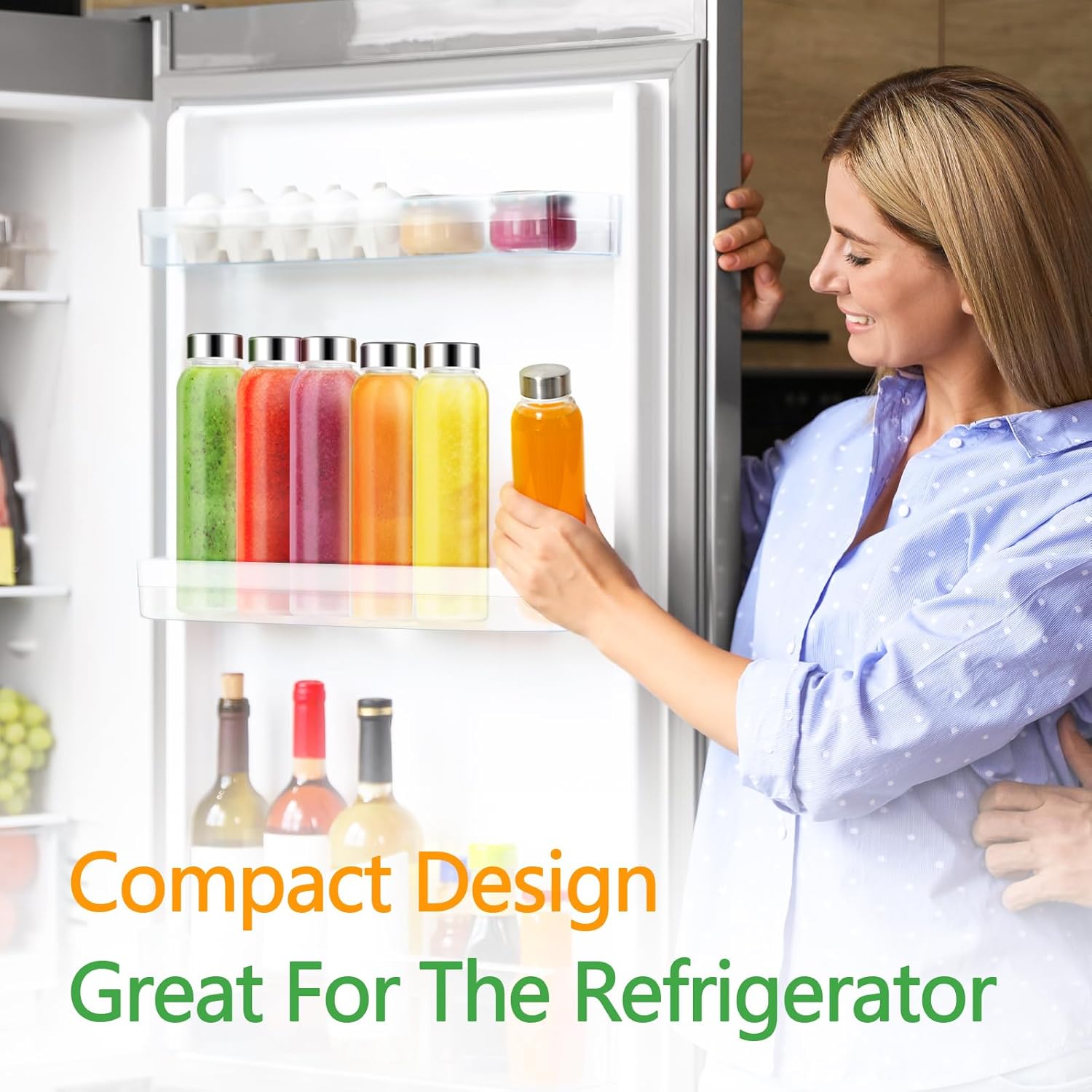 - GLASS BOTTLES FOR JUICING AND MORE: Durable stainless steel lids with air and water-tight seals, so it's completely airtight to keep your beverage fresh without any worry of spills. Throw this glass water bottle in your bag or car and get a healthy start to your day with a juice, smoothie, ice tea, iced coffee, Kombucha or water. The 100% leak proof glass bottle will never leave a leaky mess no matter how you place it. The clear glass helps you quickly spot the drink you're in the mood for.