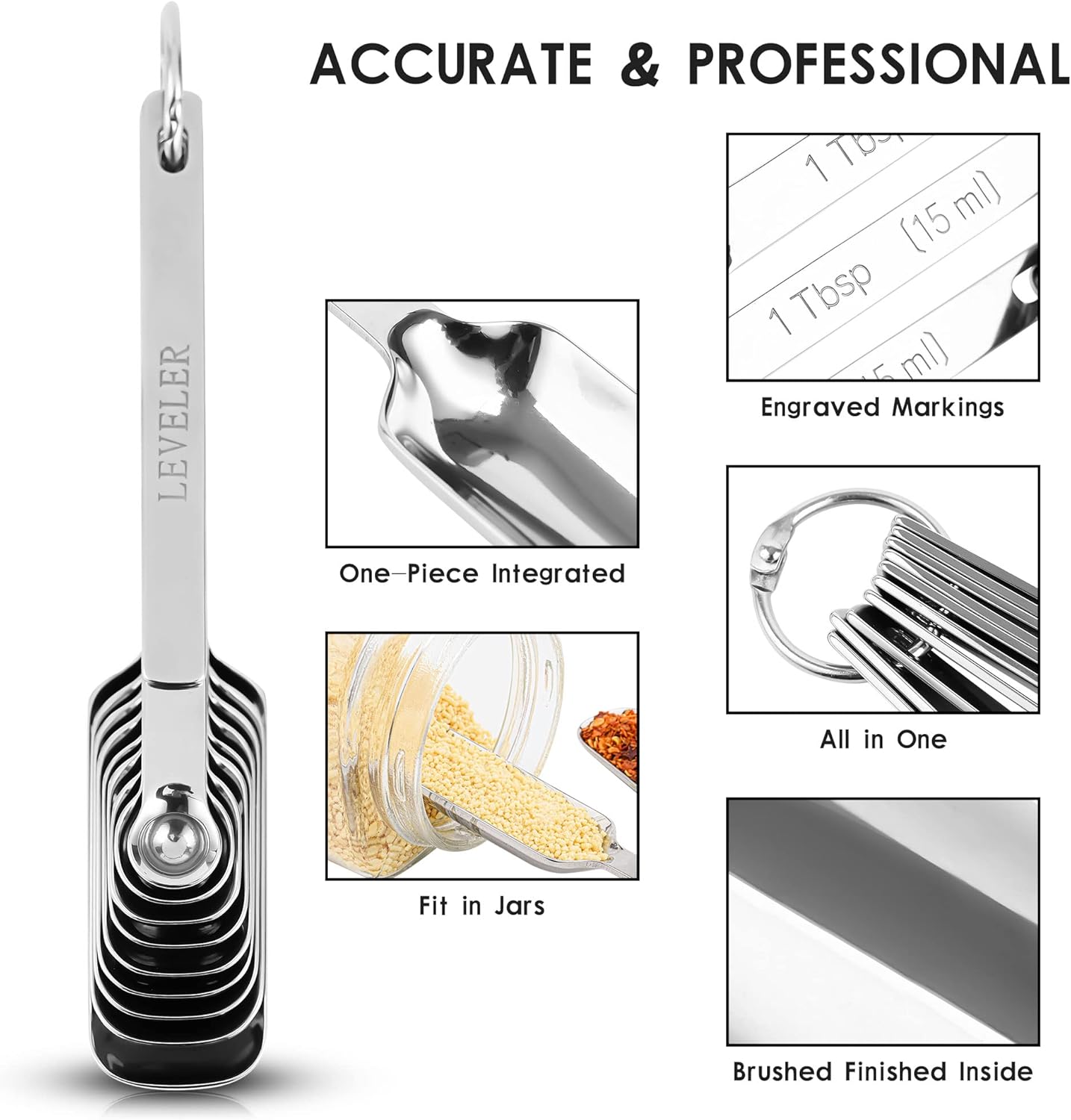 - MANY SPECIFICATIONS- 9 Measuring Spoons (1/16tsp-0.32ml, 1/8tsp-0.63ml, 1/4tsp-1.25ml, 1/2tsp-2.5ml, 2/3tsp-3.75ml, 1tsp-5ml, 1/2tbsp-7.5ml, 2/3tbsp-10ml, 1tbsp-15ml), 1 Leveler, 1 Ring to meet all your needs for Baking .