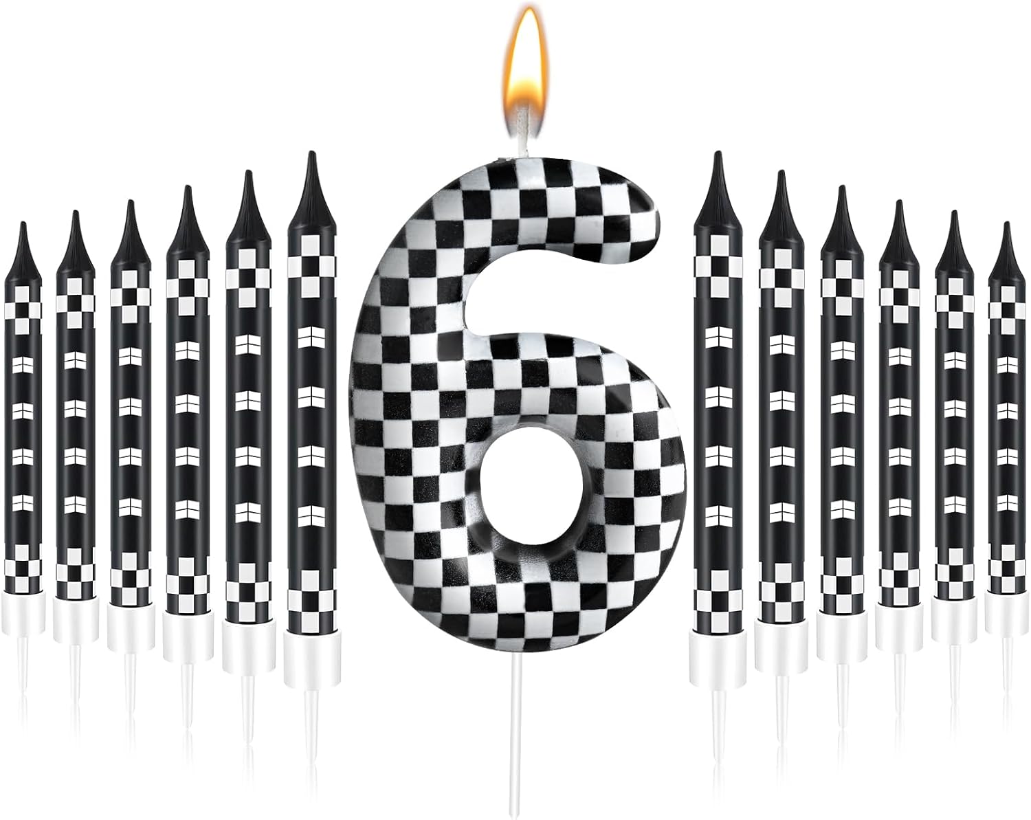 13 Pcs Racing Cars Themed Birthday Candles 12 Black and White Race Number 6 Checkered Candle Cake Topper for Racing Car Party Decoration Supplies (Number 6)