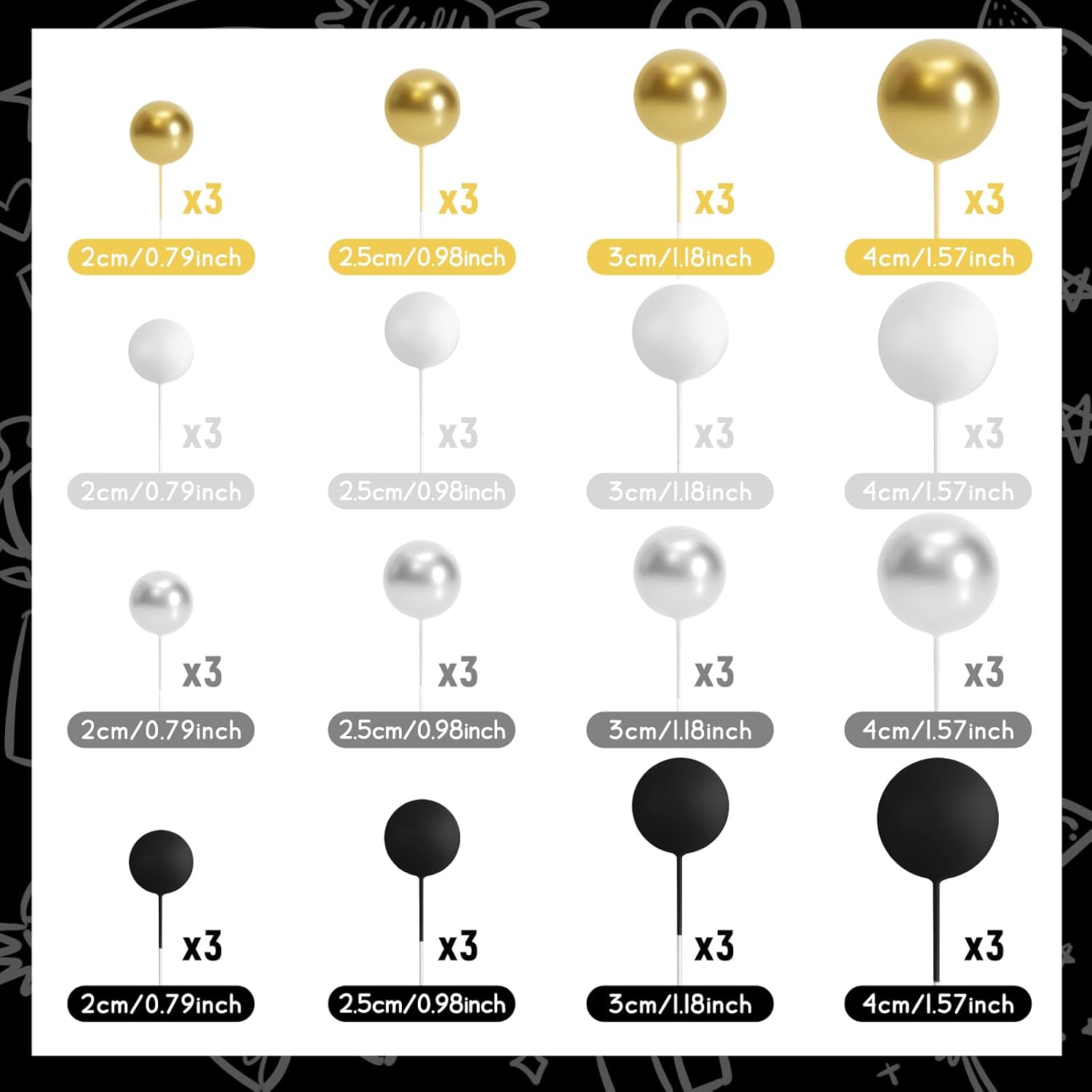 - Package Includes: You will get 48 pcs cake balls decorations in 4 colors and 10 butterflies cake decoration, including black silver white and gold. 12 pieces of each color. The quantity of each sizes and colors included in each set are as shown in the picture