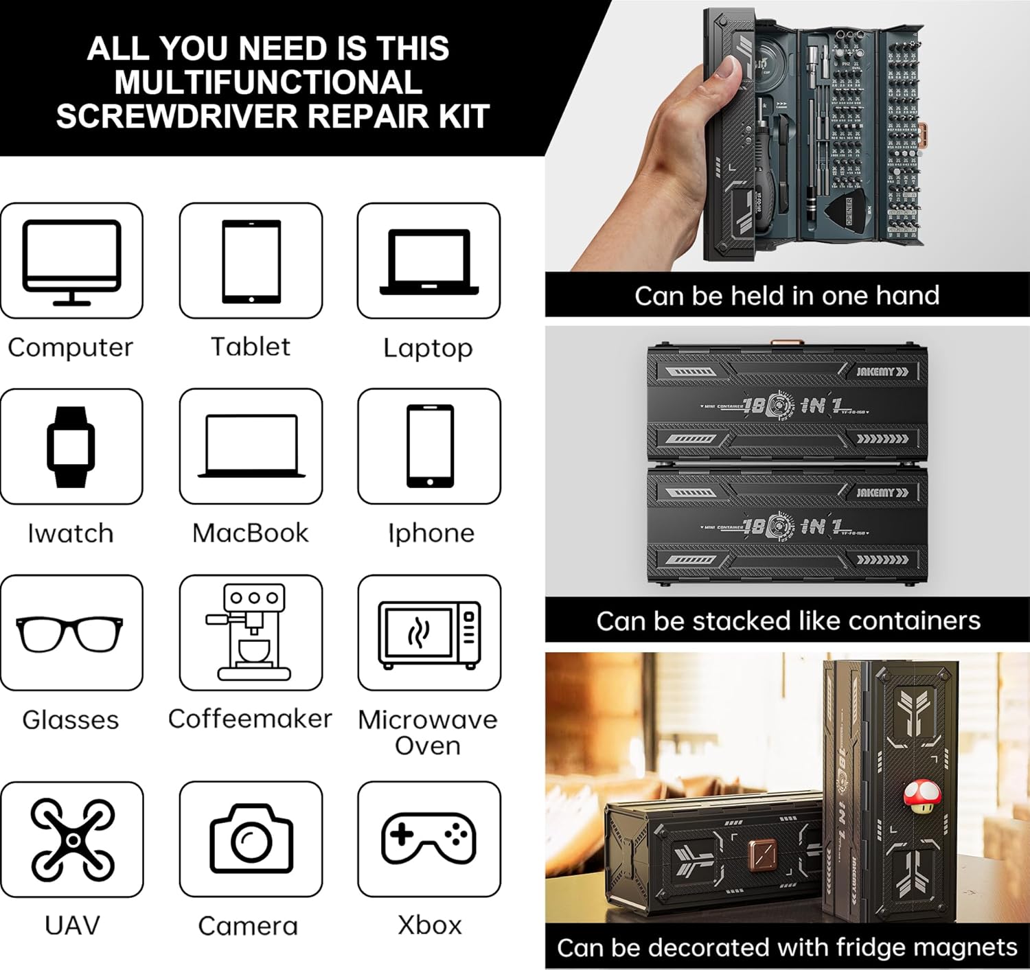 - 【 Compact Screwdriver Set 】This small screwdriver repair tool kit shaped like a container, allowing multiple sets to be stacked. 160 common magnetic bits are built into the 4 partitions for easy access and won't fall out. Each bit is marked with standard or inch markings for quick identification of the screwdriver tip you need. Also included are straight and curved ESD tweezers, opening picks, crowbars, extension shaft, bit adaptors, suction cup for easy screen removal and easy carrying.