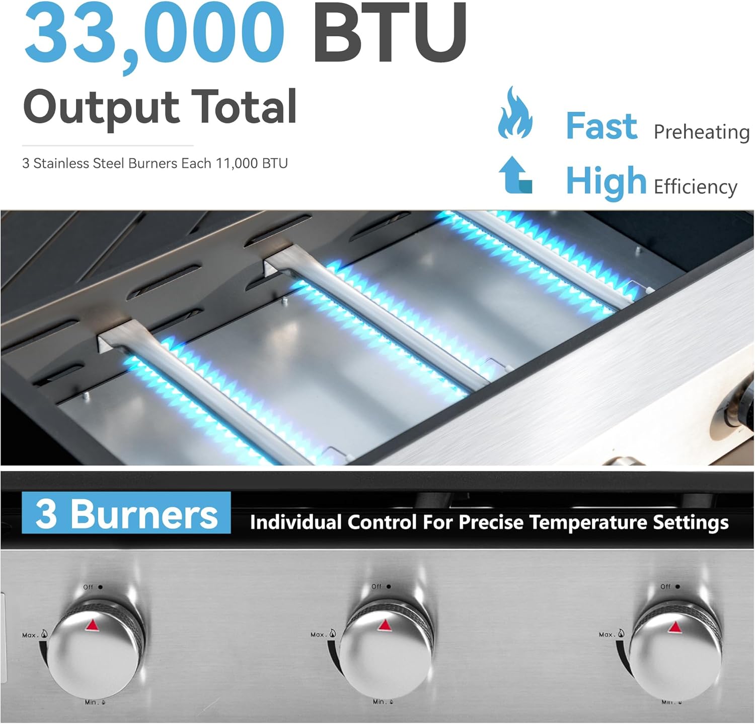 - FAST HEATING: Three separately controlled burners offer an overall of 33,000 BTU cooking power. 3 independently adjustable heat zones also allowing the option to keep certain foods warm while others cook