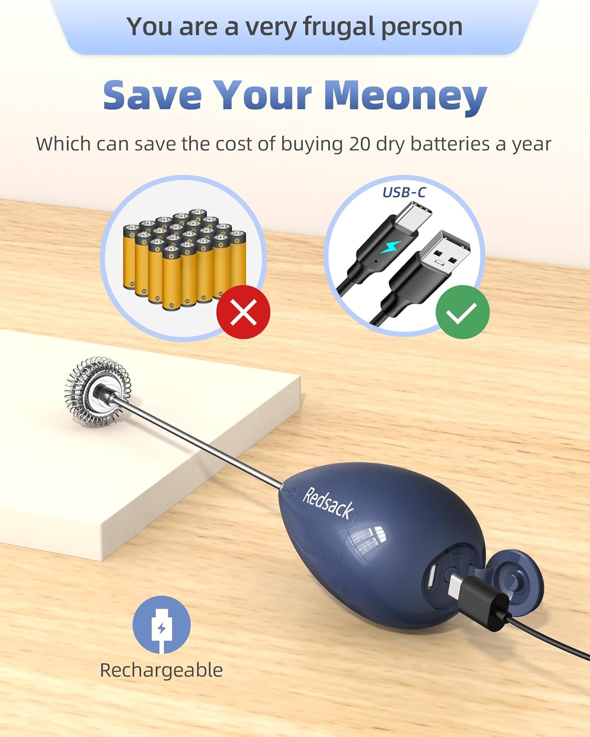 - 【You are a very frugal person】 so we use safe rechargeable batteries, which can save the cost of buying 20 dry batteries a year, and a full charge can make milk foam more than 100 times,save your meoney