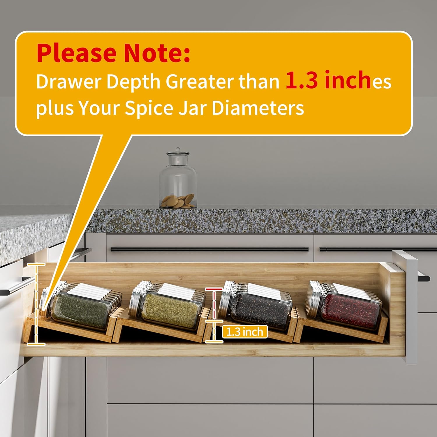 - Spacious Storage Capacity - Our bamboo seasoning organizer can hold up to 32 standard 4 oz spice jars (jars not included), thanks to its tiered design. Each piece measures 13" x 4.7" x 1.6"(4 Pieces), providing ample space for organizing your spice collection in your kitchen drawer or cabinet