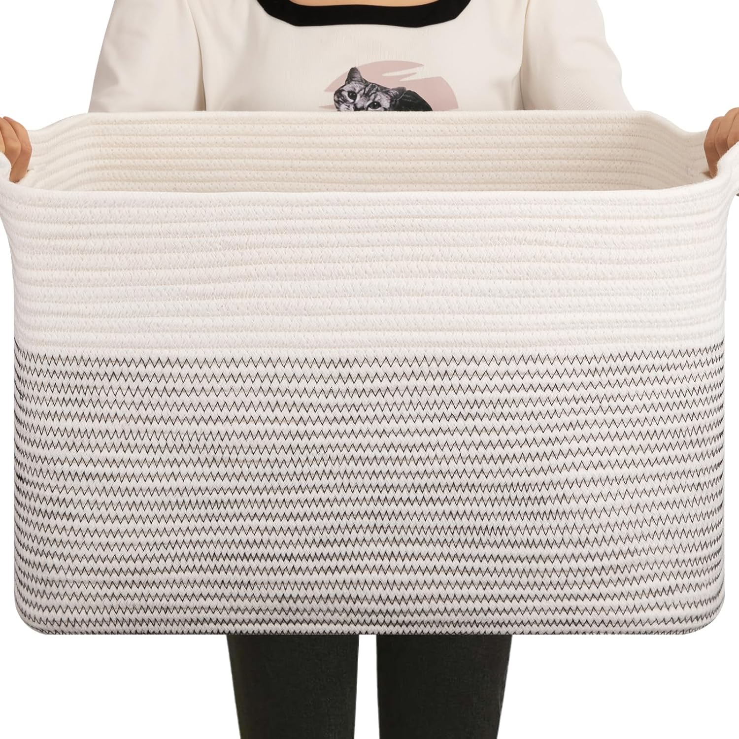 OIAHOMY 65L Blanket Basket, Cotton Rope Woven Blanket storage for Living Room, Rectangle Woven Baskets for Storage, 20''×16''×12'', Black and White