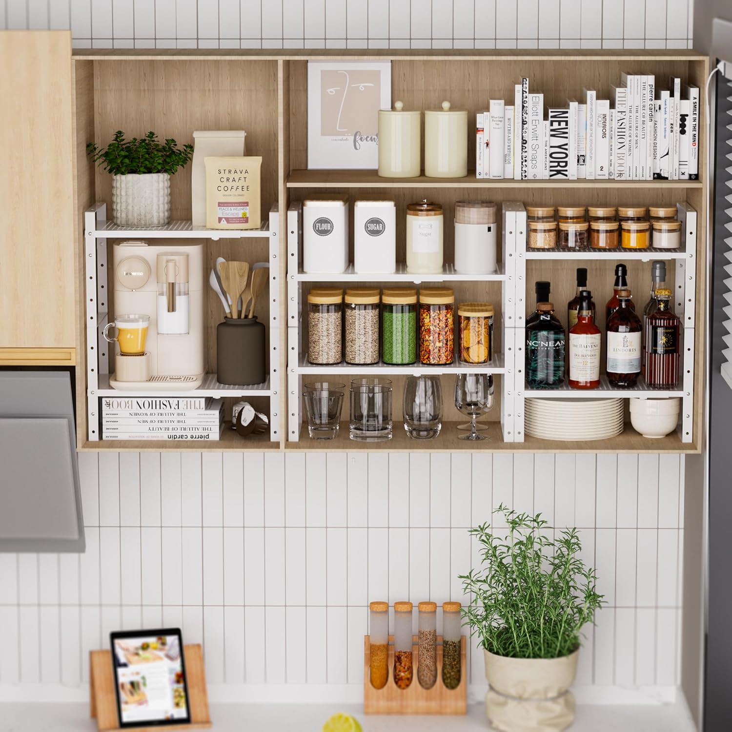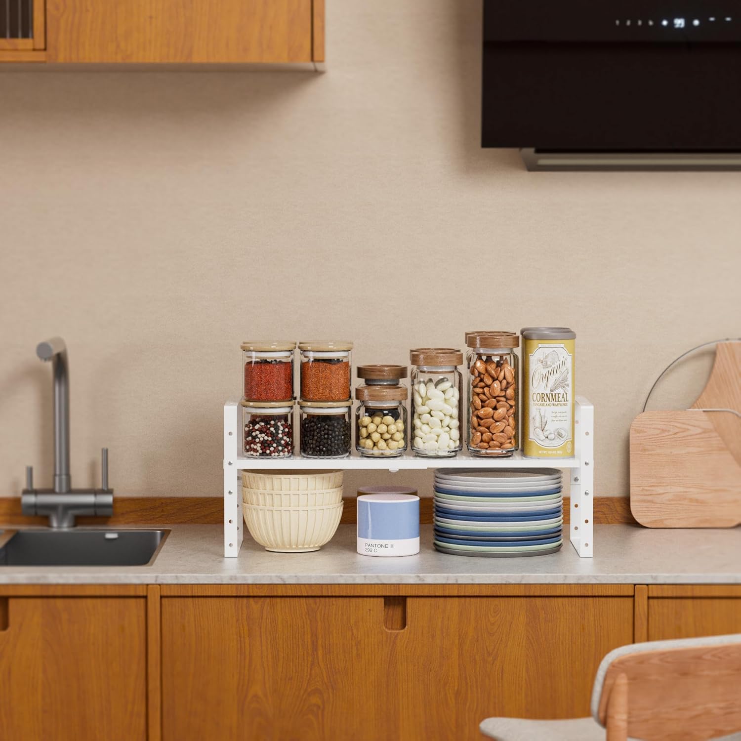 - ⭐【Versatile Spice Shelf for Cabinet】This adjustable kitchen counter stand shelf instantly create additional storage space.It is very helpful to organize the Bottles, Cans, Bowls, Plates, Pans, Soup pots in kitchen,Pantry and cupboard.Also a great space-saving option for the bedroom, study, sitting room, bathroom, and more.