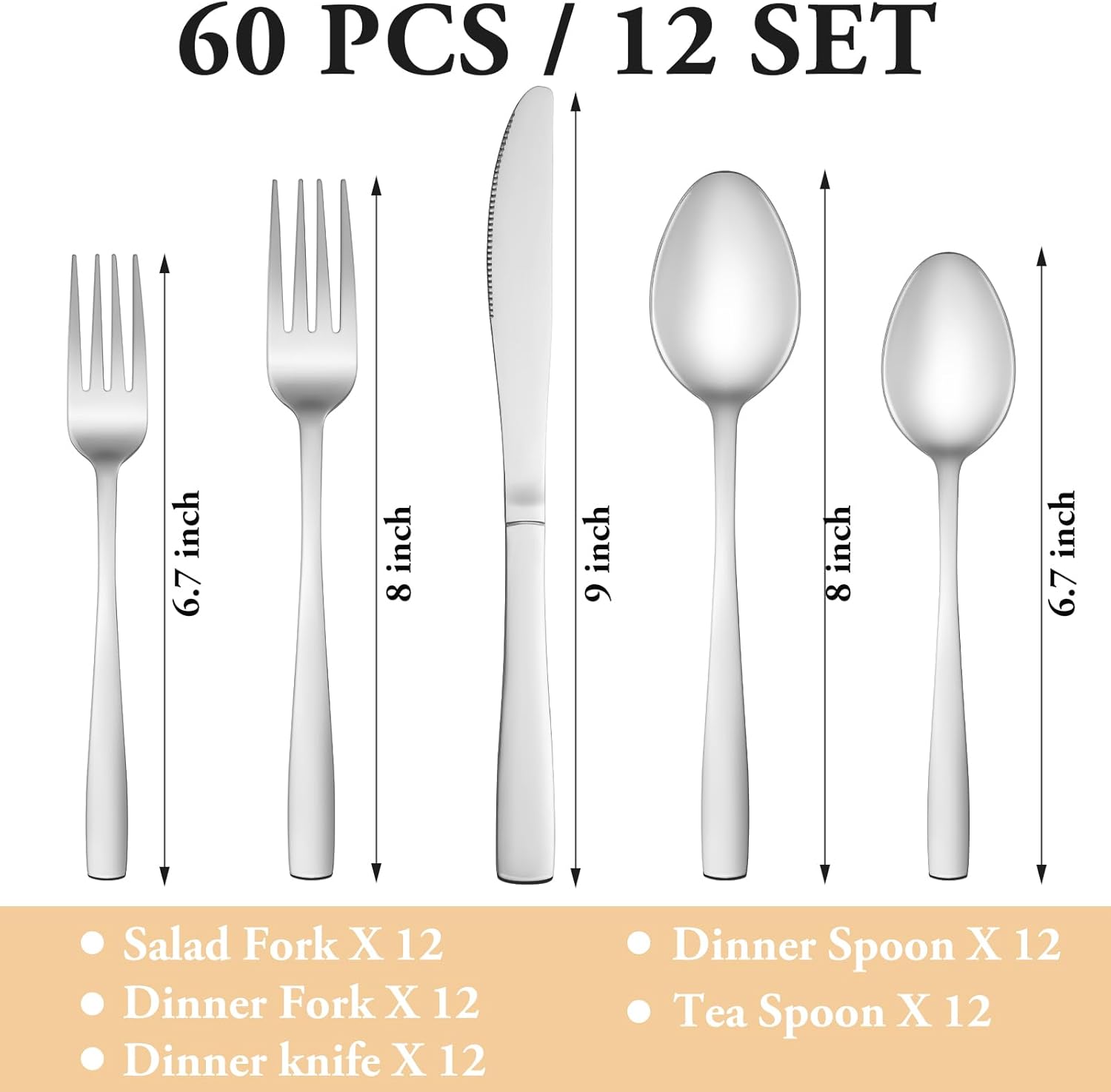 60 Piece Silverware Set Service for 12,Premium Stainless Steel Flatware Set,Mirror Polished Cutlery Utensil Sets,Durable Home Kitchen Eating Tableware Sets,Include Fork Knife Spoon,Dishwasher Safe