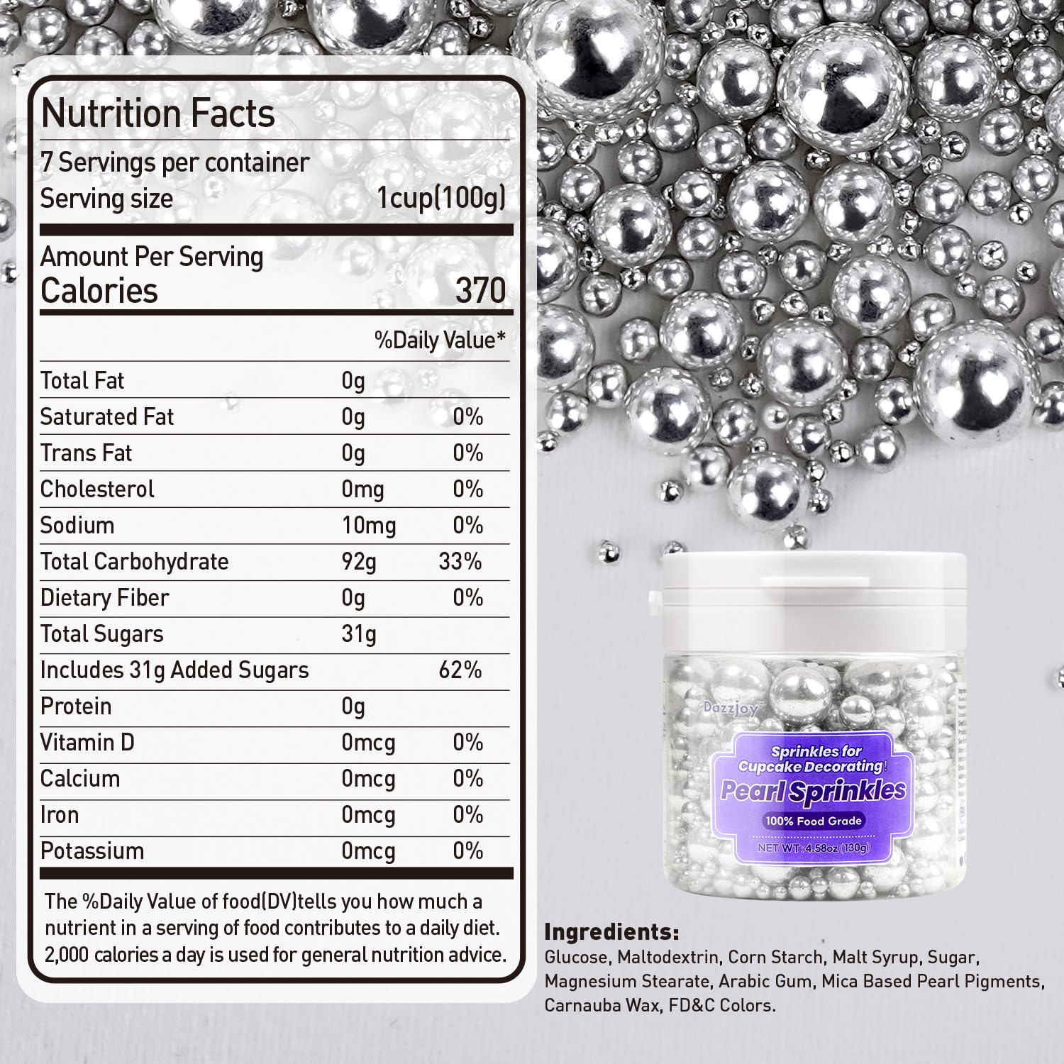 Dazzjoy Silver Pearl Sugar Candy Sprinkles, Edible Pearl Mix Size, 4.58oz, Cake Decoration & Cake Toppers, Baking Cake Decorations, Wedding Party Valentines Easter Supplies