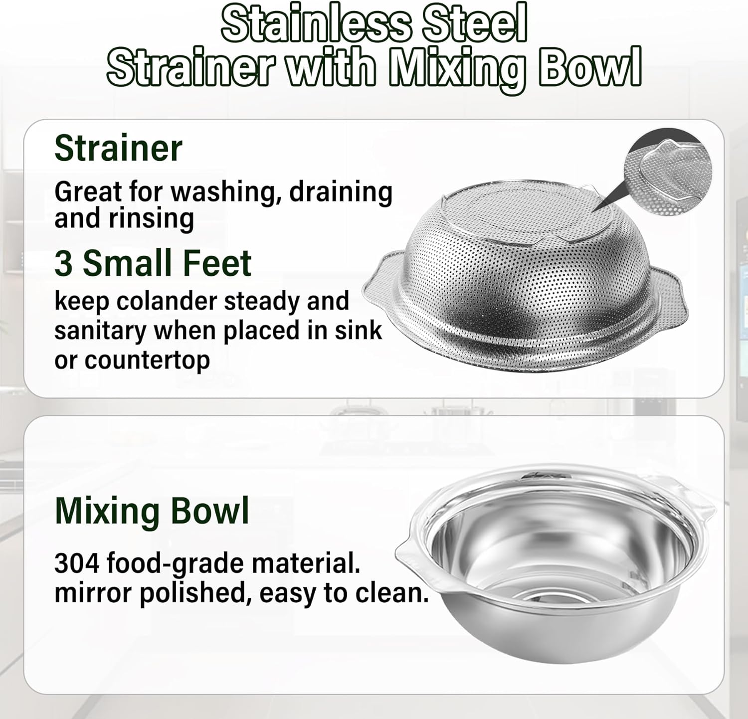 - 3 Size for Choice: The metal strainer with handle and mixing bowl have 3 different size for your choice. 2.5QT(10"L x 8.8"W x 3.55"H), 3.5QT(11.5"L x 10"W x 3.55"H), 4.5QT(12.5"L x 11.5"W x 4.2"H). You can use it to strain what you need.