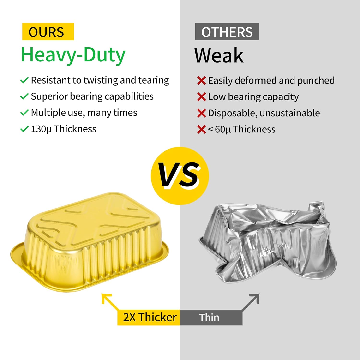 - 【Heavy Duty Aluminum Pans with Lids】Our 1.5lb small cake pans with lids are sturdy enough to hold your heaviest meals! Not all foil pans are created equal, ours are extra thick and 2 times thicker than regular silver foil pans, so they won't tip over and lose their shape! These small aluminum pans come with leak-proof PP lids, perfect for baking, cooking, roasting, freezer storage, and takeout containers.