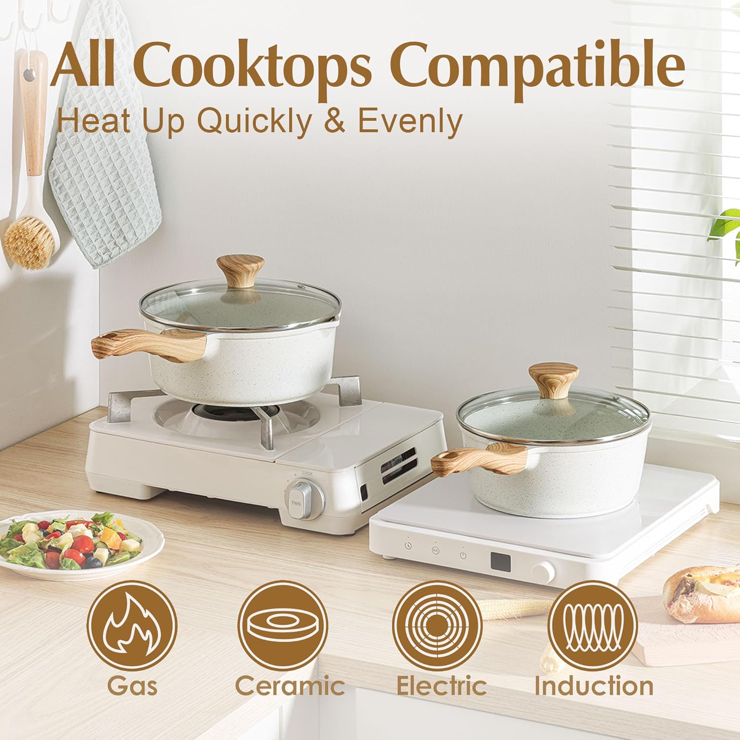 - Suitable For All Stoves - High magnetic conductive stainless steel base allows the 3 qt saucepan with lid nonstick to work on all cooktops, including induction, glass stovetop. The core of sauce pan is made of cast aluminum, which is sturdy, long-lasting and heats up quickly and evenly.