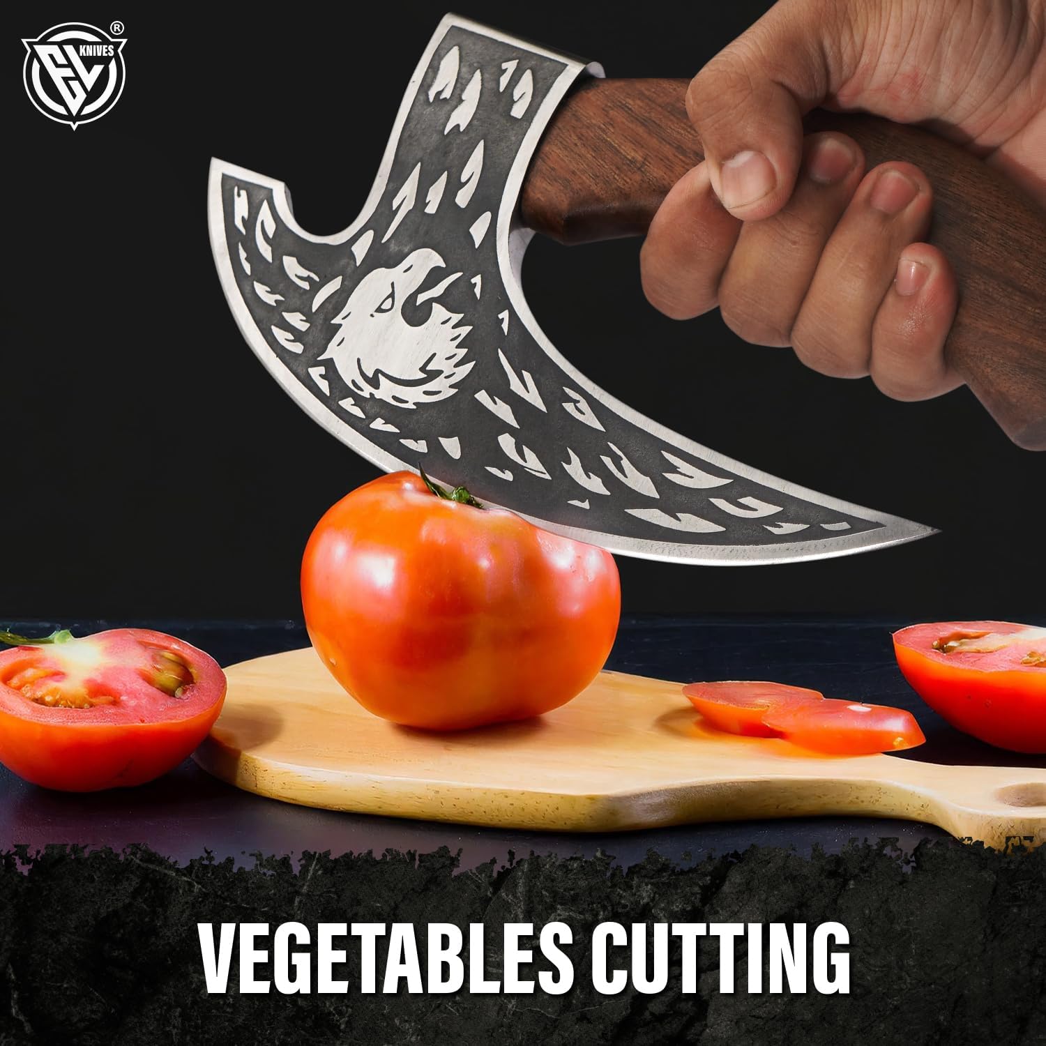 - ✅ EXCEPTIONAL GIFT CHOICE - This cool small Viking Axe is perfect for anyone who loves cooking and Viking stuff. This small Viking axe is super durable and can do lots of jobs, like cutting meat, veggies, or even pizzas and sandwiches. You can use it in the kitchen or out in the garden or for hunting. It's not just for show; it's a real helper!