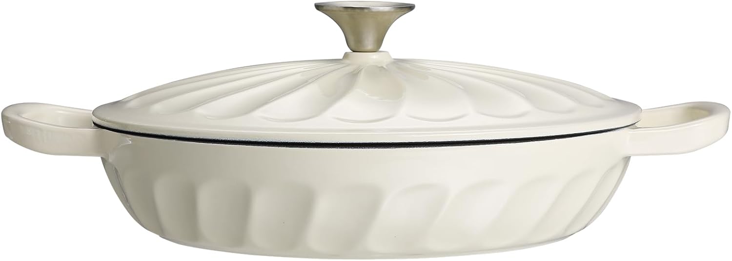 - Enameled cast iron braiser with lid is made of thick, heavy-duty cast iron with a glossy enamel finish and white, non-stick enamel interior, it has exceptional heat conduction, retention, and distribution for reliable cooking